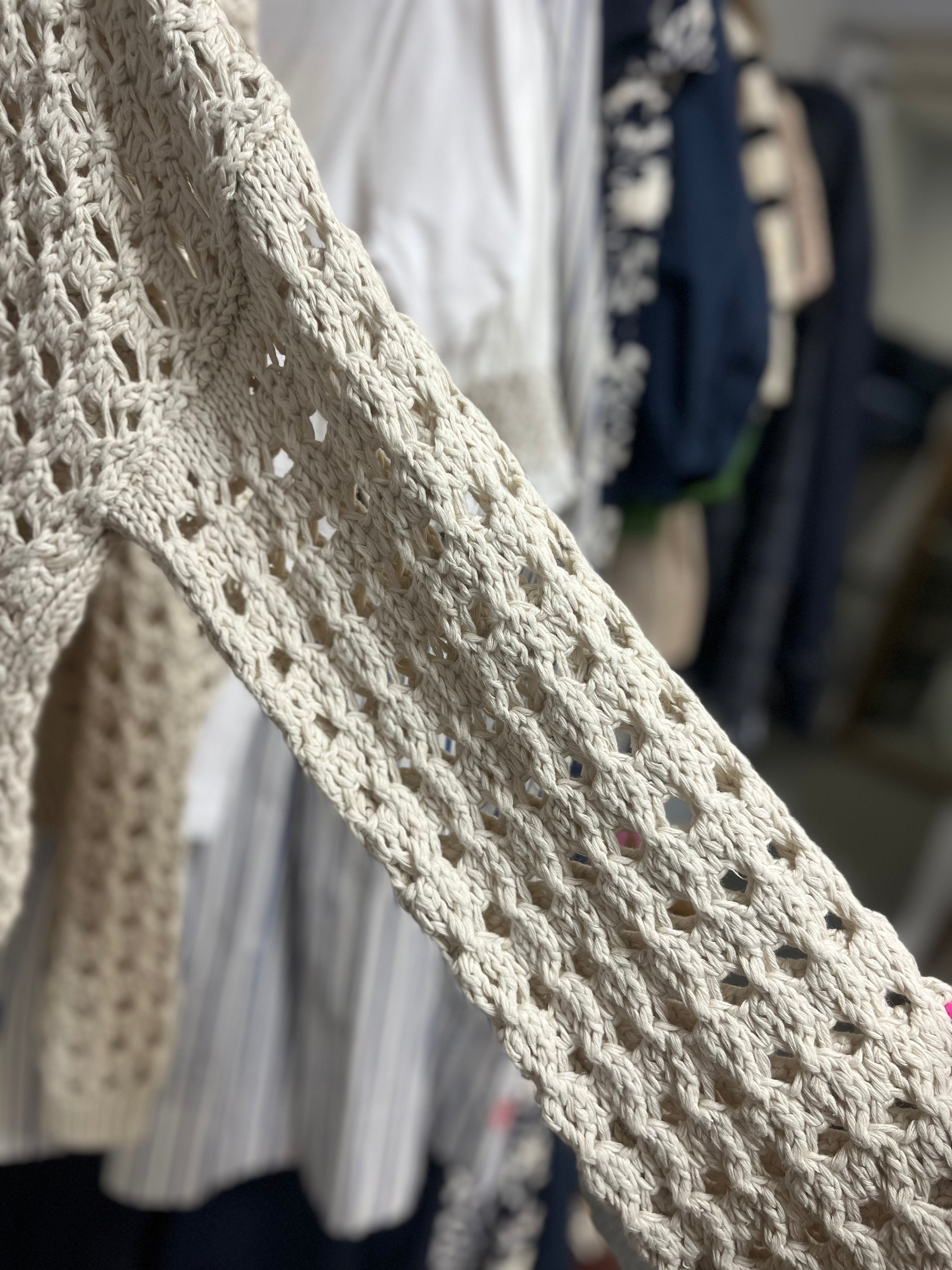 A cream woven knit sweater with a relaxed, beige loose-knit finish. Perfect for layering in Spring, Summer or Fall.