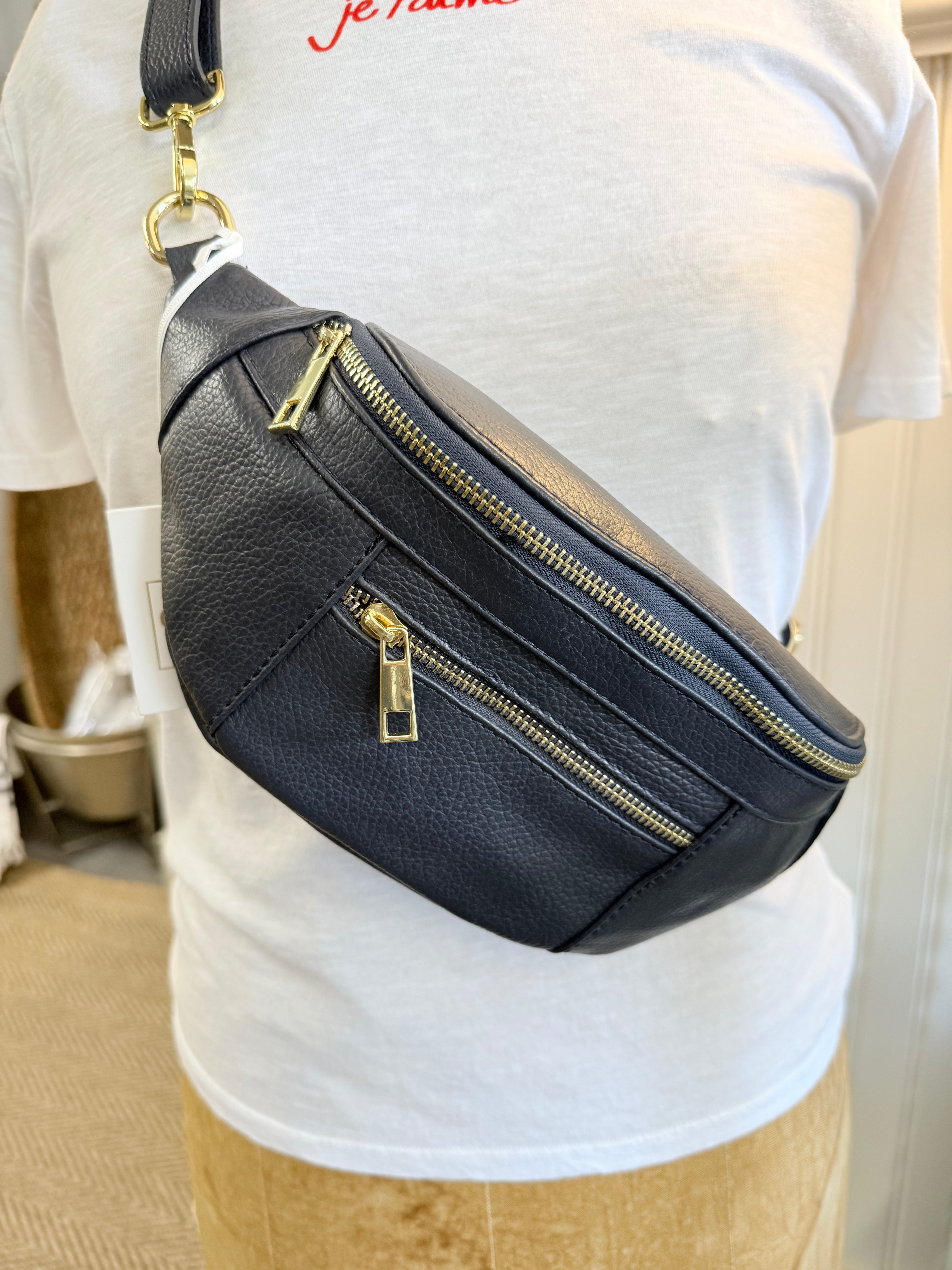 This slightly pebbled Italian leather crossbody has an adjustable strap so bag can sit tighter to the body or looser.  It can also be worn around the waist.  Gold hardware dresses up the bag and the zipper is easy to open while bag is on you.  Inside there is another small interior zip pocket and plenty of room for a phone, small wallet, lip gloss and change.  Our owner carried this bag thru Europe and loved the ease of it, not to mention the safety!