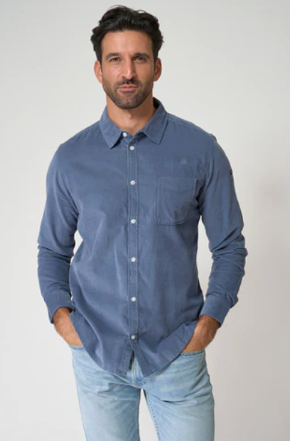Classic men's long-sleeved shirt, crafted from fine corduroy fabric, offering a soft feel and a warm, elegant finish, ideal for this time of year. It features a button-up cuff and an additional button at the placket for a comfortable and secure fit. The shirt has a button-front closure and a practical and functional patch pocket on the chest.