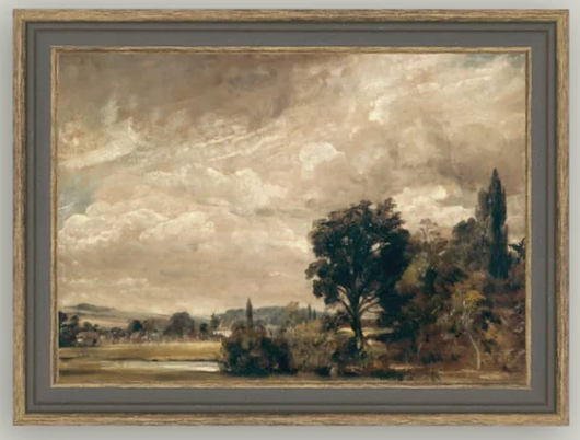 This horizontal vintage-inspired print showcases The Fisher's House 1829 By John Constable. Framed in a two-tone brown frame, the image has a beautiful, neutral color palette. Hang it in a small space, place it on a bookshelf or pair it with others to create a beautiful gallery wall.
