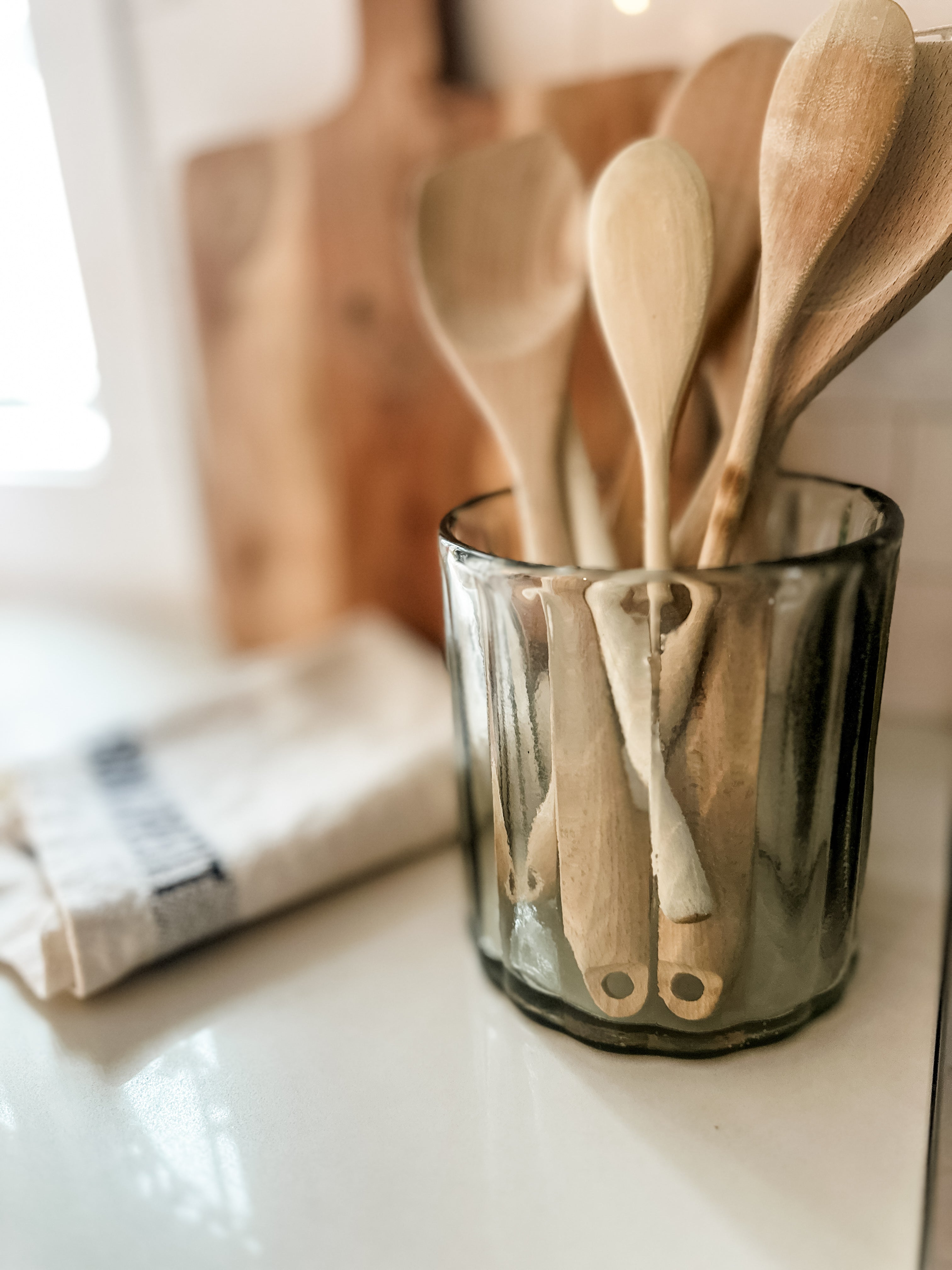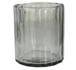 This glass, ribbed vessel has a slight green hue.  Whether you use it by the cooktop for cooking utensils or brighten your home with a bunch of fresh flowers its sure to become your go-to vessel.  It could even work as a beautiful votive w/ a chunky pillar candle.