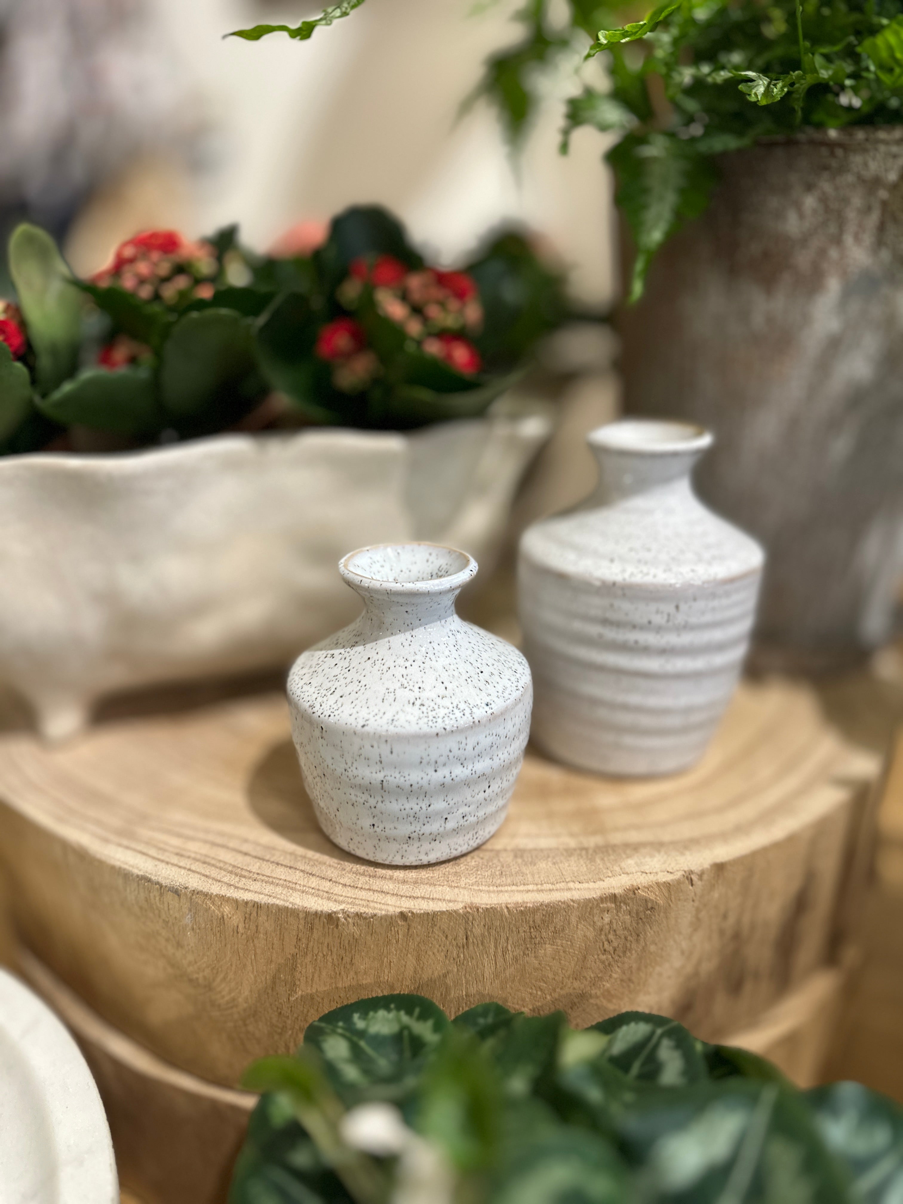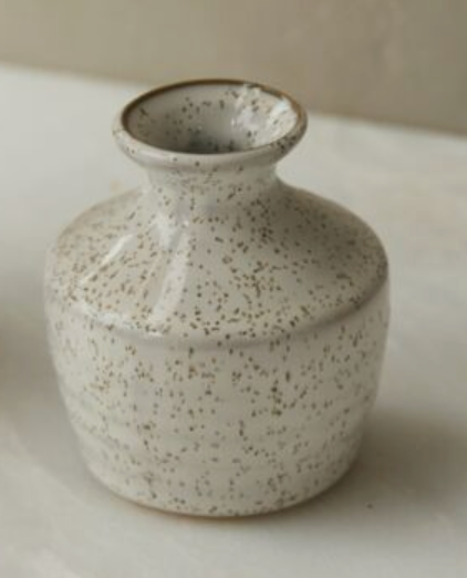 Add a touch of artful, understated elegance to an event or styled moment with the ceramic Hari bud vase. Featuring a warm white speckled glaze & slight horizontal dimension across the surface, these seamless artisanal bud vases stand out with a few bright stems.