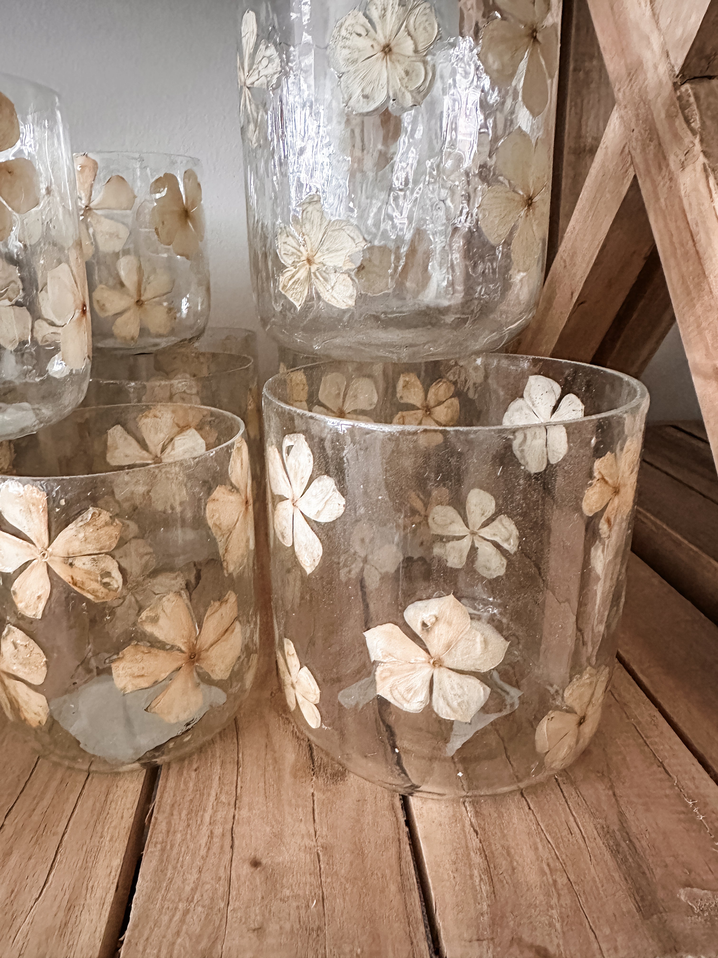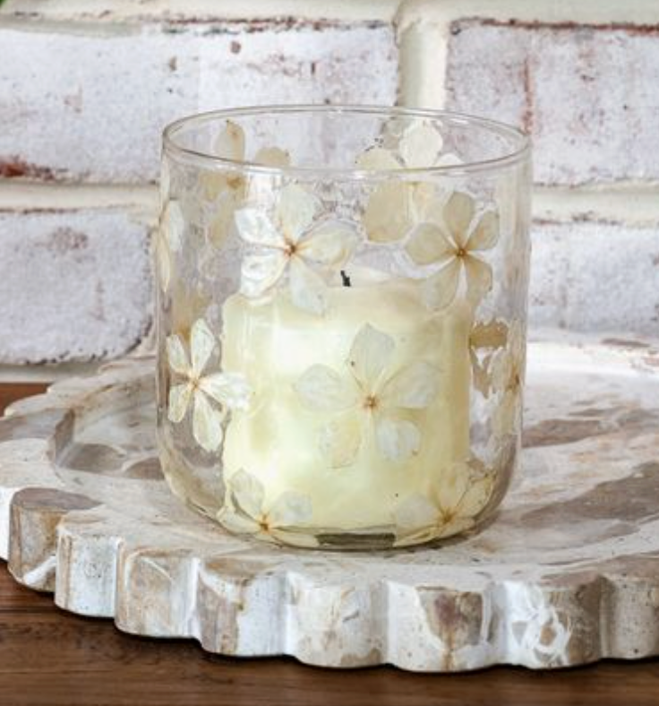 This glass votive is embedded with dried, beige flower petals. Add a votive candle and add a touch of special to your table.  Variation in the glass gives it a vintage vibe.