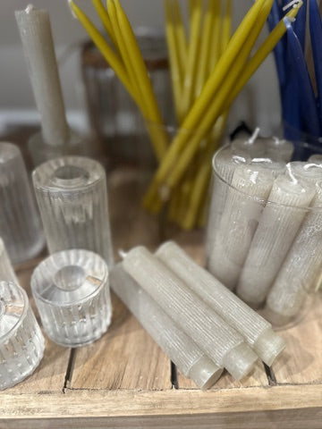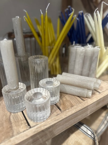 This intricately carved set of taper candles features a striking, sculptural pleated design. Add warmth and elegance to any living or dining space with this stunning set of votive candles. Unscented; Made from 100% Paraffin Wax.