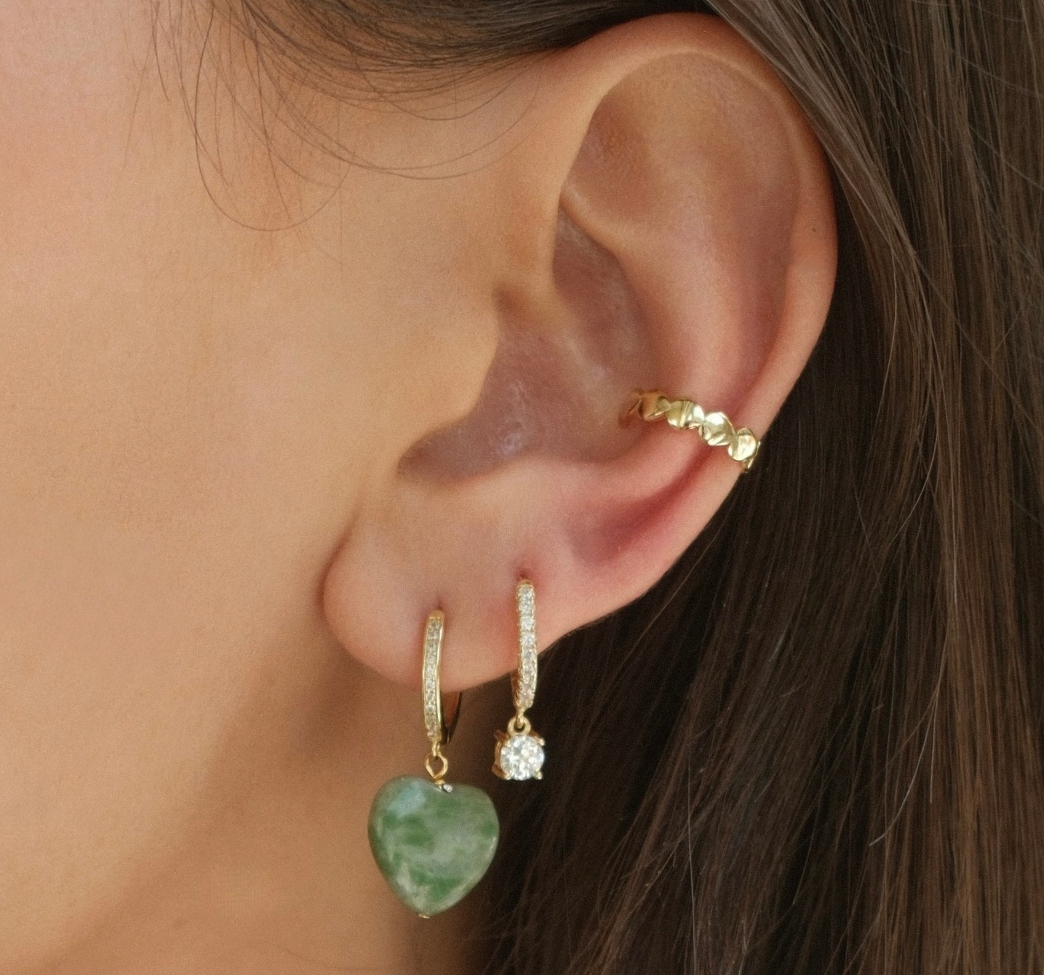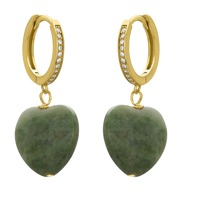 Pavé huggies finished with heart-shaped jade charms, a playful pop of color for your stack.