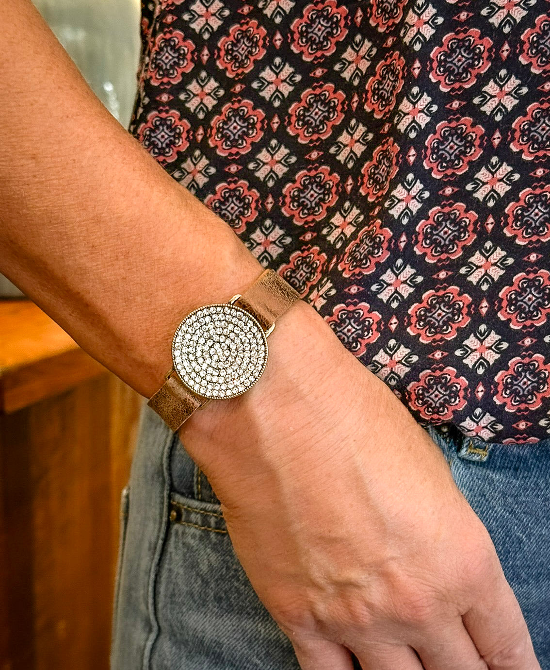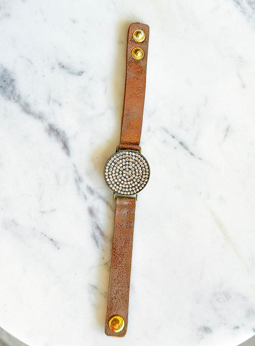 Add subtle shine to your look with this pavé disk bracelet, featuring a genuine leather strap and a 2-snap close to adjust to any wrist size. A versatile piece that transitions effortlessly from day to night.  Wear alone or add more for a fun army candy look!
