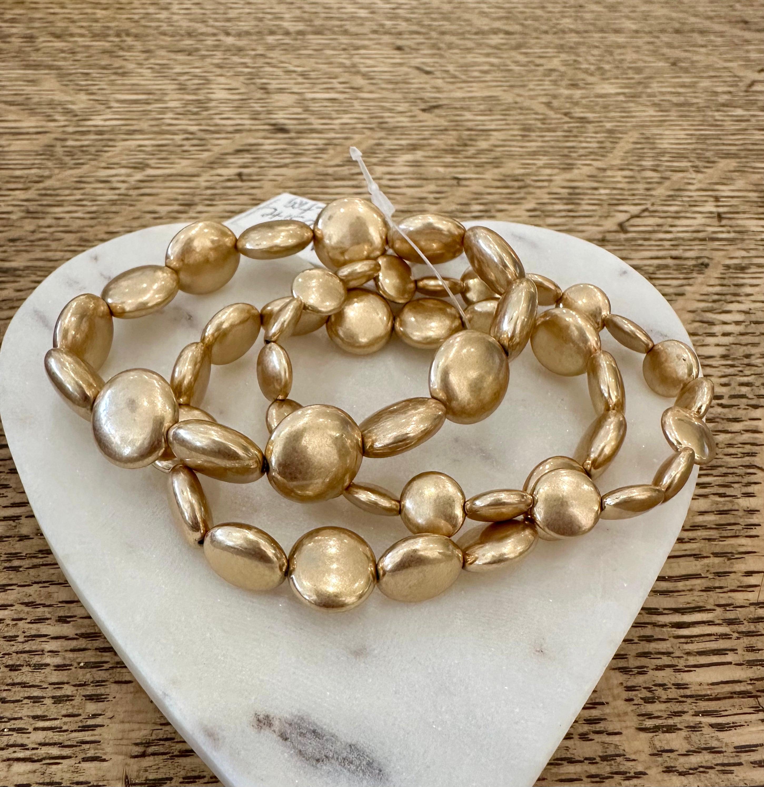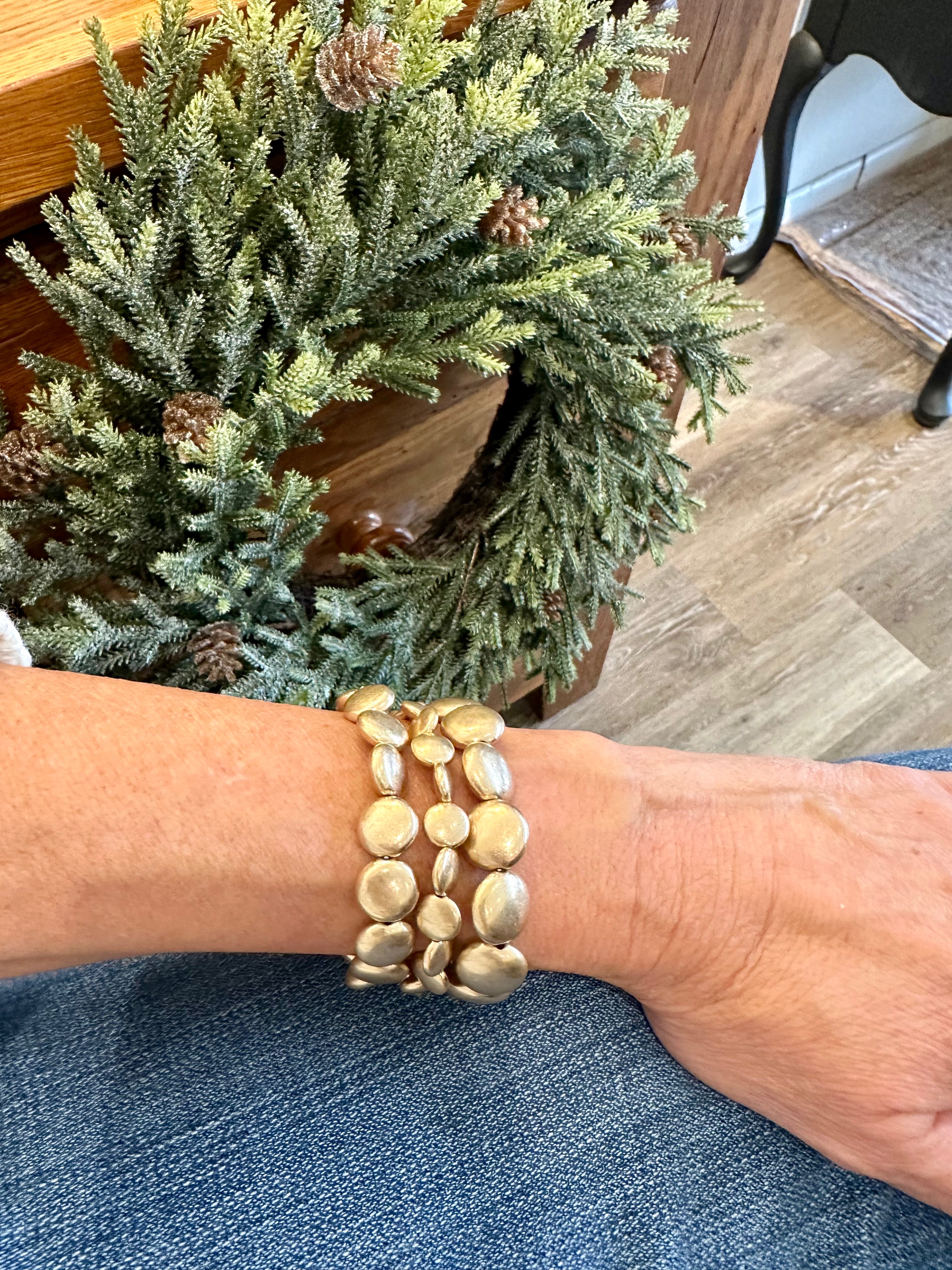 Lightweight, comfy, and full of charm, the stacked disc bracelet layers three strands of smooth discs into one effortlessly stylish piece. Its stretch fit makes it an everyday favorite, perfect for stacking, mixing, or wearing solo. A favorite piece of costume jewelry for adding instant flair.