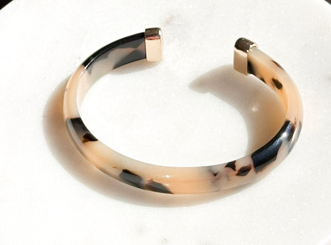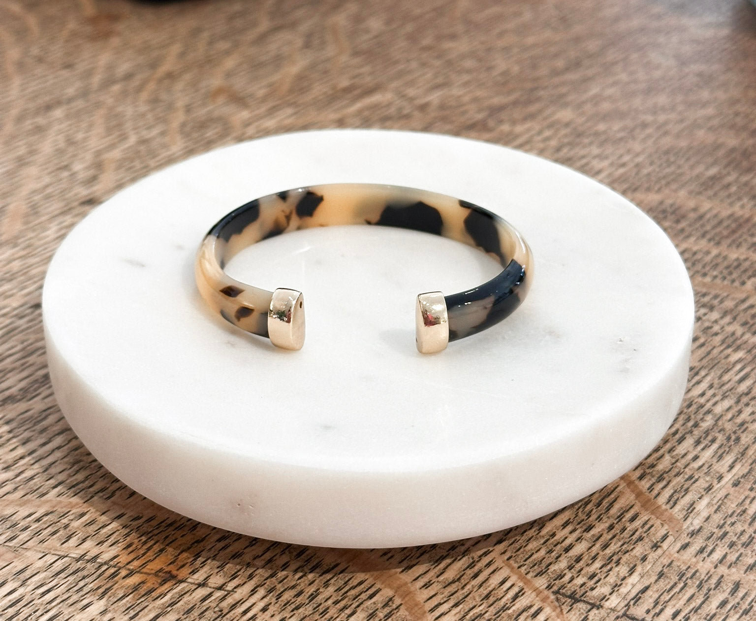 Tortoise vibes!  This slim cuff is the perfect accent to Fall colors.  Gold caps on the end points dress it up.  Wear alone or stack other with it for a fun arm candy look!