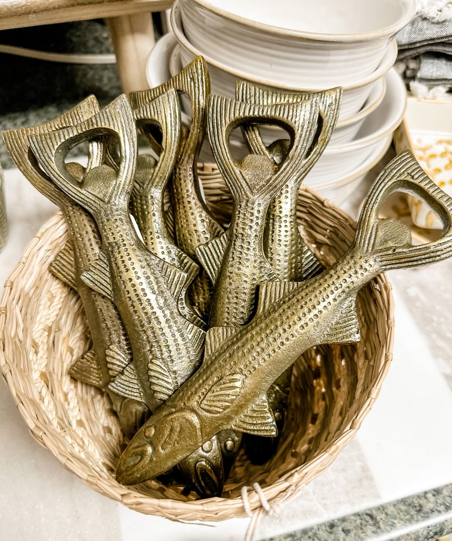 This antique gold finish whimsical fish shaped bottle opener not only adds character to your home bar, but also serves as a functional tool for opening your favorite beverages. Perfect for any fish lover or anyone looking for a unique bottle opener. A must-have addition to any kitchen or bar collection!