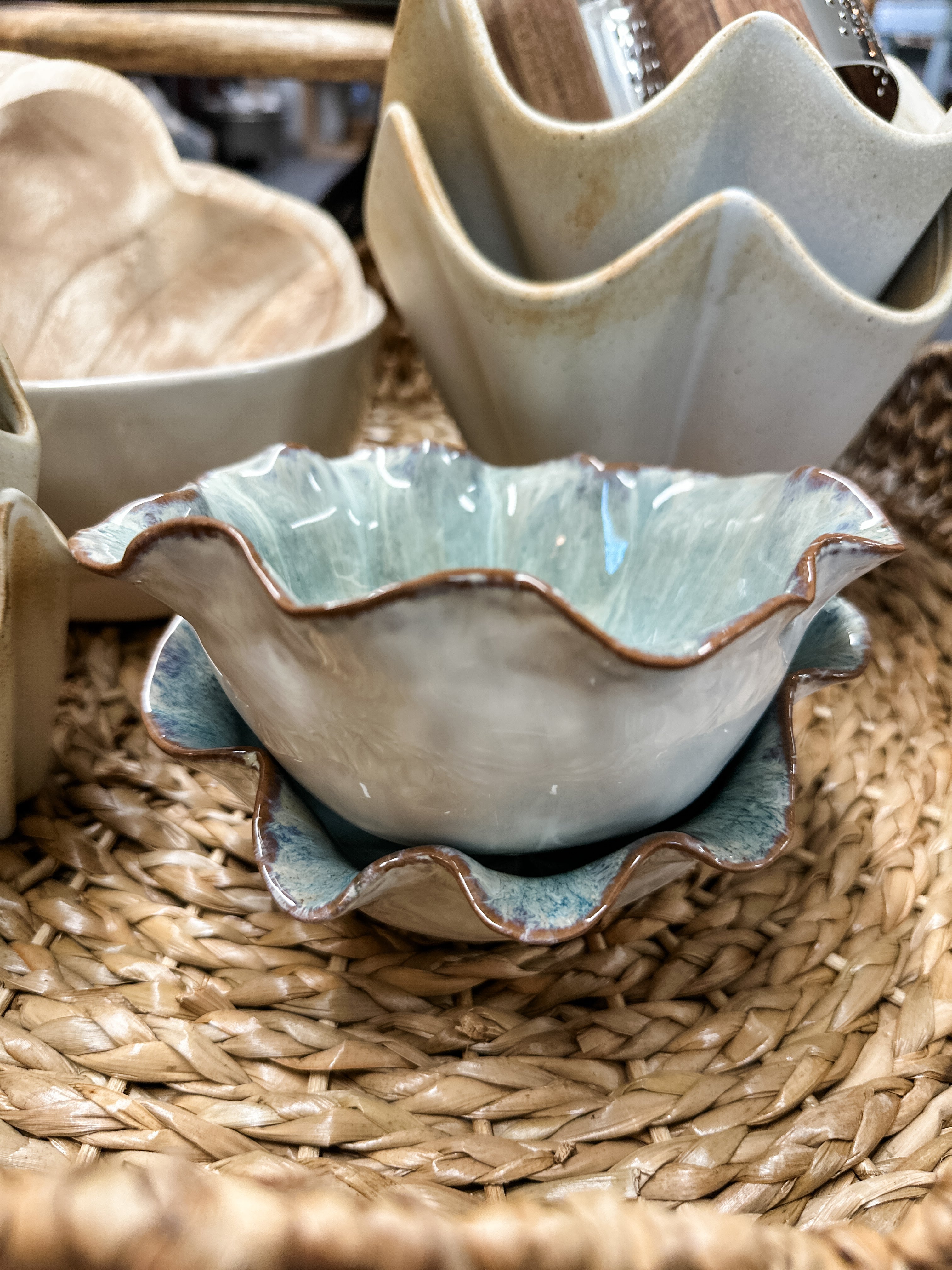 This ceramic bowl is as pretty as a flower. Blue-green glazing on the interior, white glazing on the outside and a brown trimmed edging make this piece a stand out!