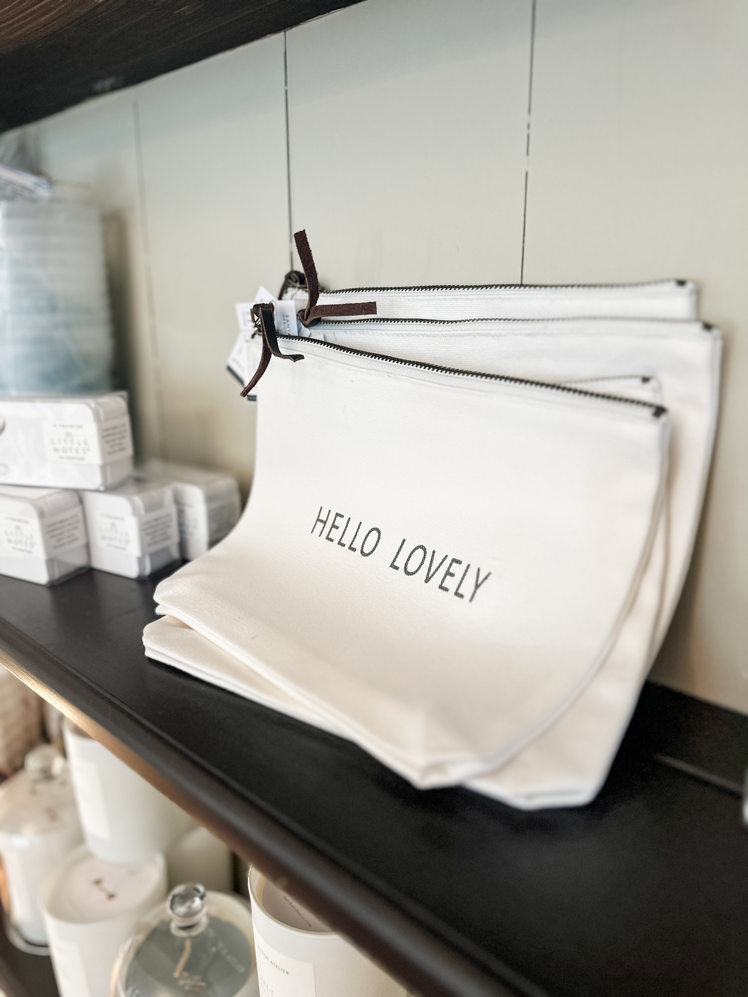 White canvas pouch with leather zipper pull is perfect for yourself, or as a gift! Throw in your lipstick, phone, cash, cords and more! Ideal size for tossing in any tote, backpack or purse.