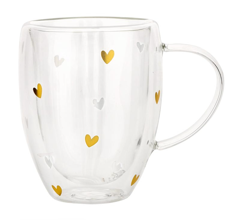Elevate your coffee or tea game with this glass mug w/ gold hearts.