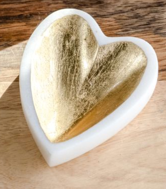 This charming 4-inch heart dish is a perfect catch-all for jewelry, trinkets, or those little treasures that deserve a special home. A marble base kissed with shimmering gold foil accents.