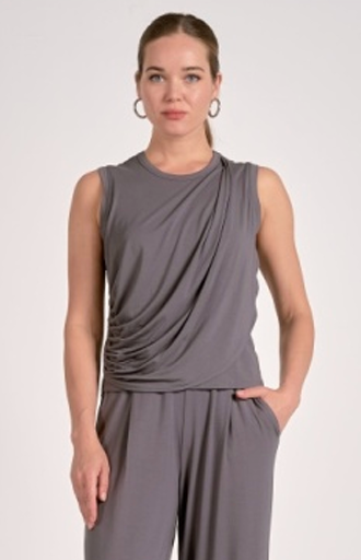 This is the PERFECT layering piece.  A notch up from a basic tee, this silk-like top has a beautiful drape that layers down and over the front.
