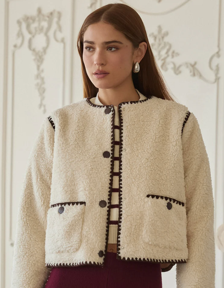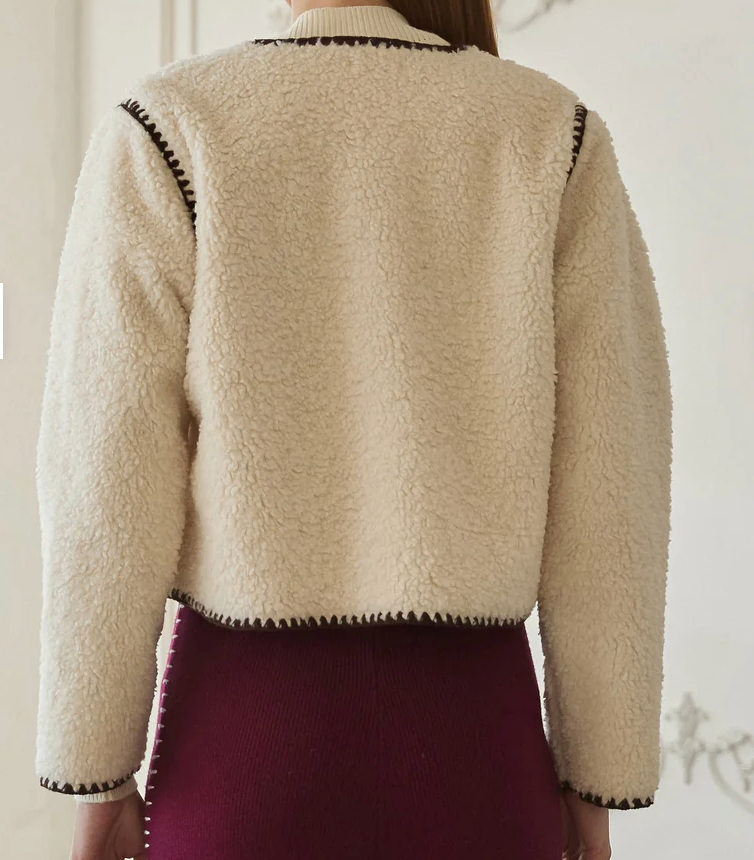 My new fav! Wrap yourself in this ivory & chocolate sherpa jacket. Designed for comfort and style, this plush sherpa layer features a warm ivory exterior accented with chocolate-brown detailing. The ultra-soft texture provides exceptional warmth, while the relaxed fit makes it perfect for layering over your favorite tees, or knits.