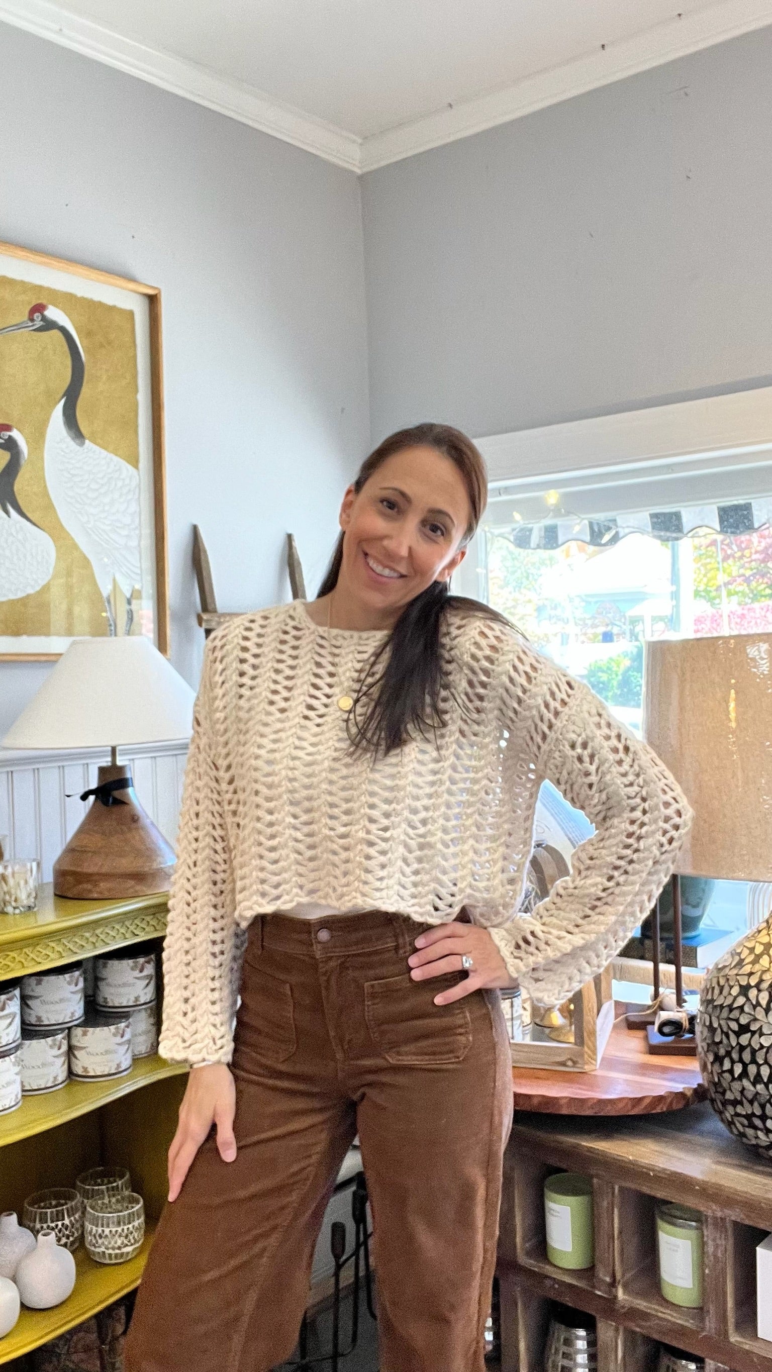 Fabric: Ultra Loose Knit Material. Cropped Length Sweater Top. Scoop Neckline. Semi Bell Sleeve. Drop shoulder.