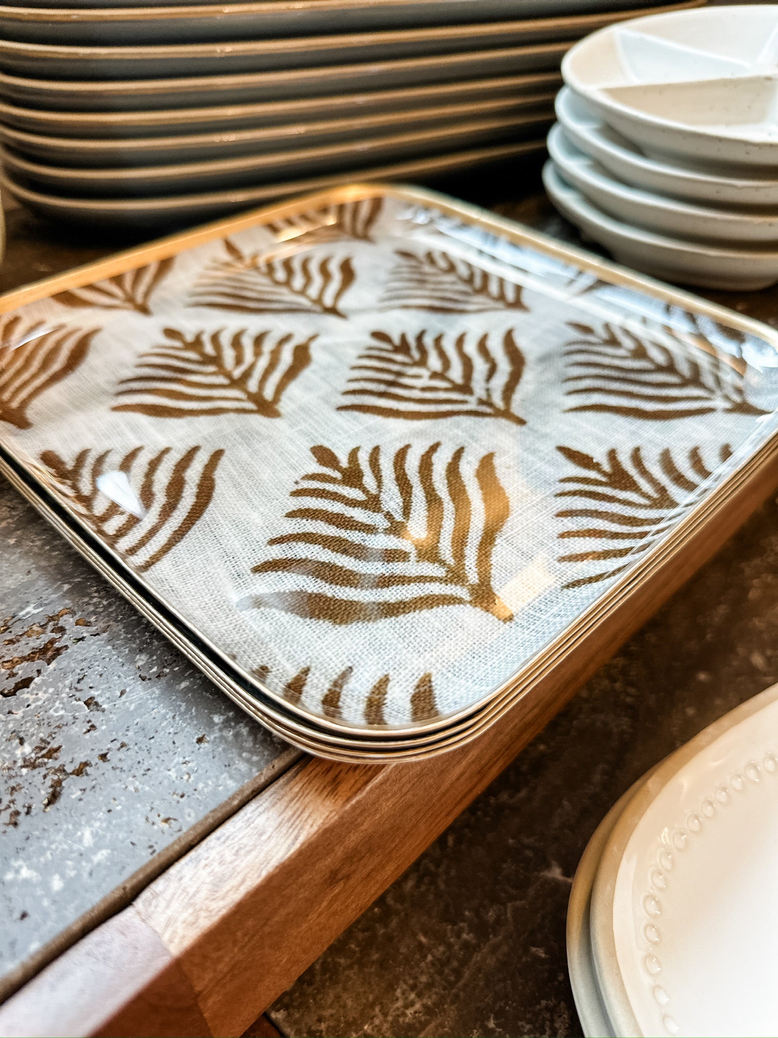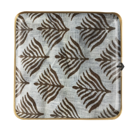 Featuring digitized prints inspired by traditional block-print patterns, its warm blue and brown botanical design adds a touch of elegance. The square shape and compact size make it perfect as a catchall for small essentials, a decorative tray, or even a stylish base for your favorite candle.