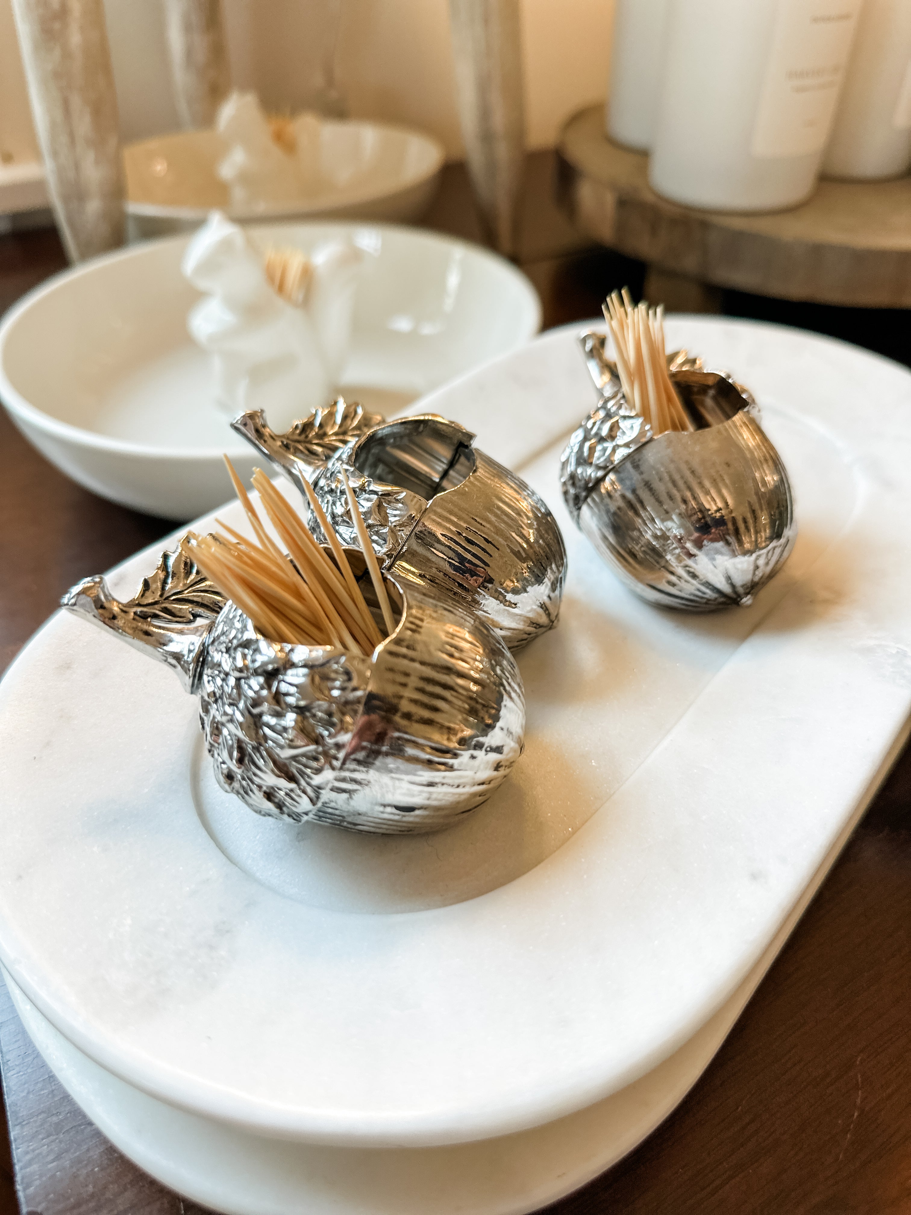 Add a touch a festive to your cheese board with this cast aluminum, heavy-weight toothpick holder.  The acorn design is the perfect compliment to your Fall entertaining needs.