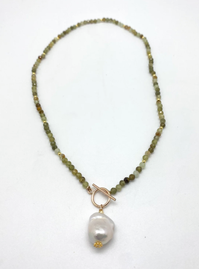 This hand crafted necklace combines tiny moss garnet stones with a large baroque pearl. The toggle clasp is gold-filled and the necklace is 17” long.