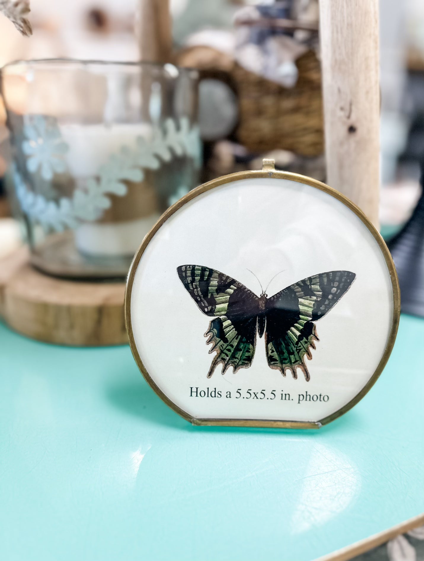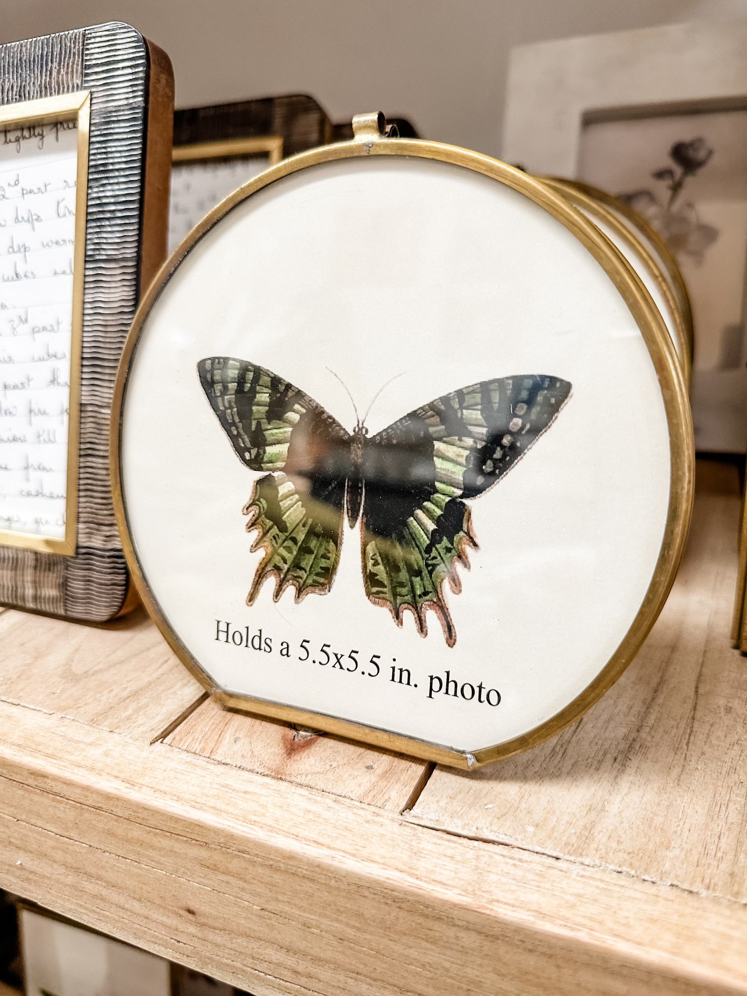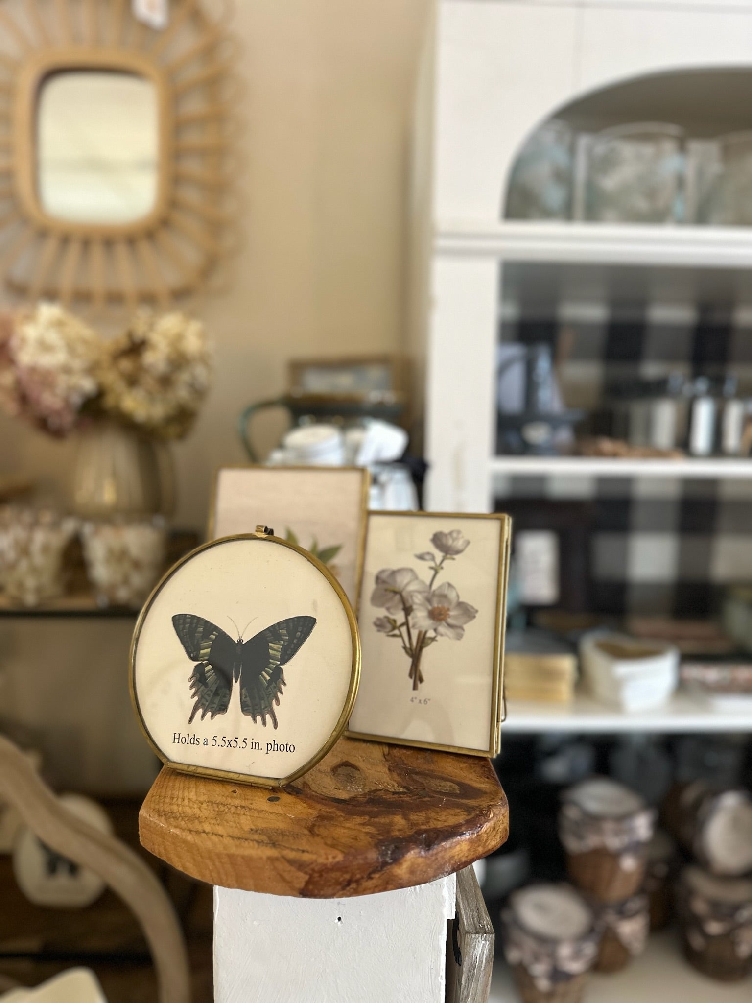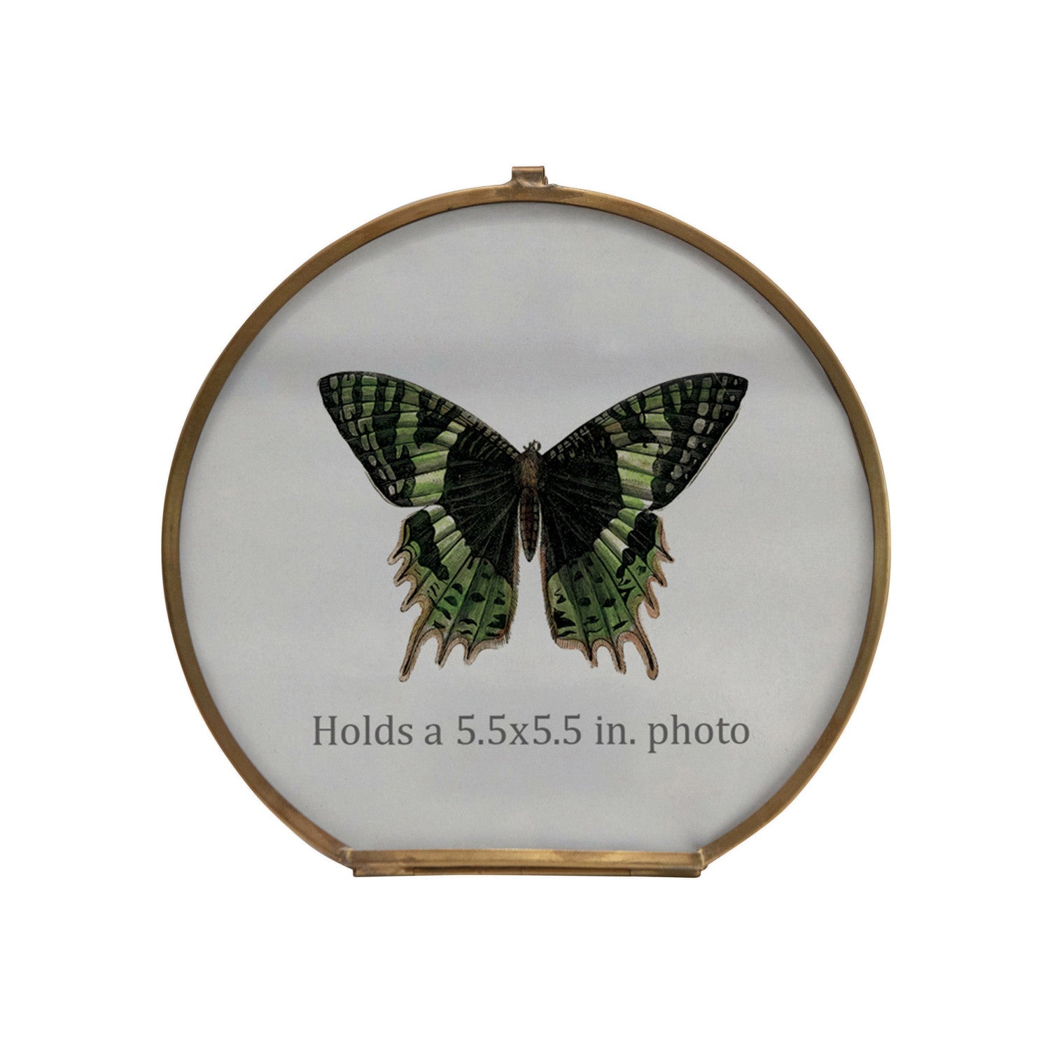 Add a touch of charm to any space with this brass trimmed frame. Back "kick stand" is in same material. Print a picture and cherish those memories! Design tip...place the frame on a stack of books for a book shelf moment.