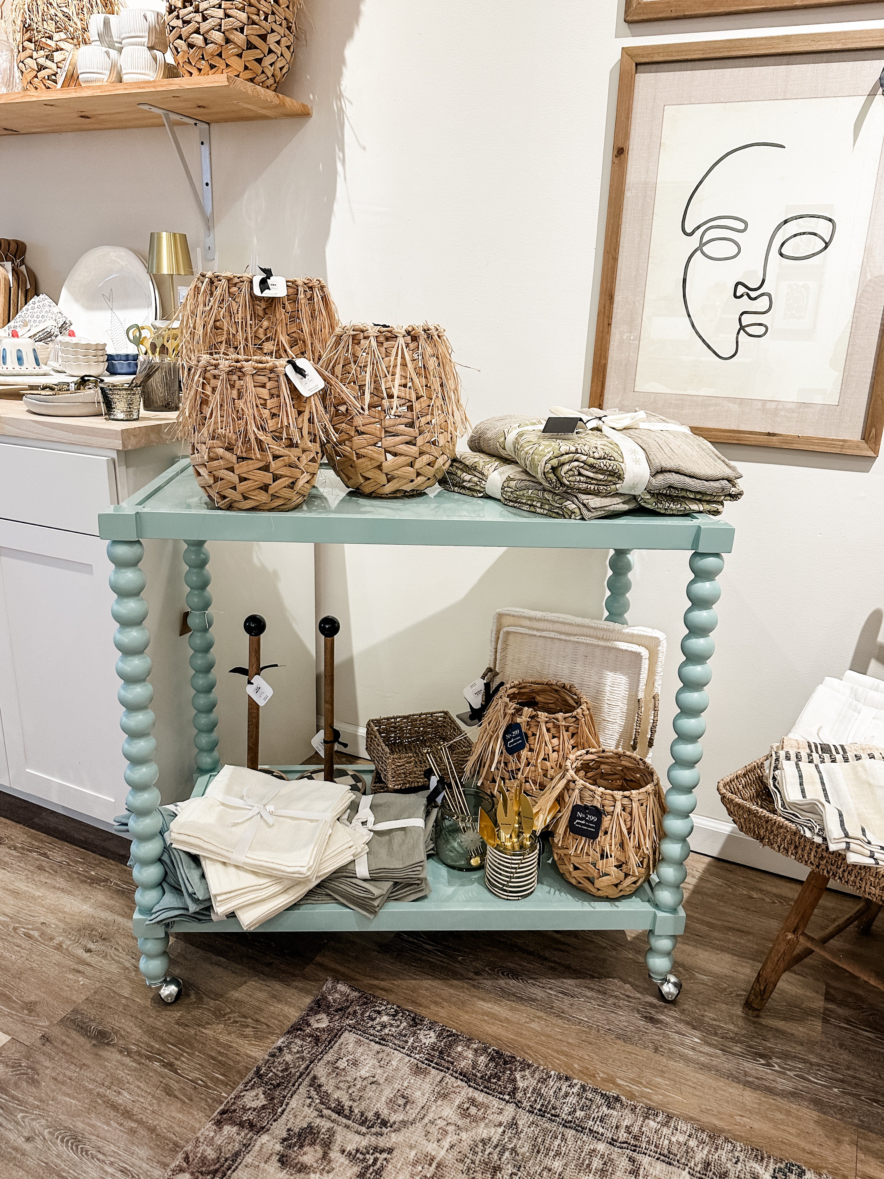 The striking blue finish provides a bold contrast to the natural wood grain, while the dual tiers offer ample space for an array of items, from cocktail supplies to decorative accents. Each shelf can support up to 44 pounds, making it as sturdy as it is stylish. The smooth caster wheels ensure mobility, allowing anyone to bring the party to any room.
