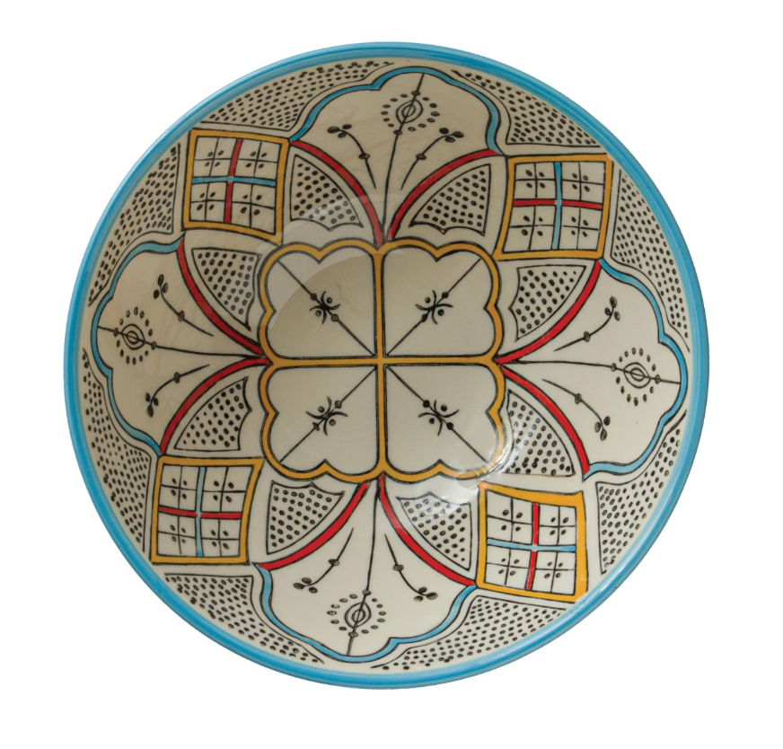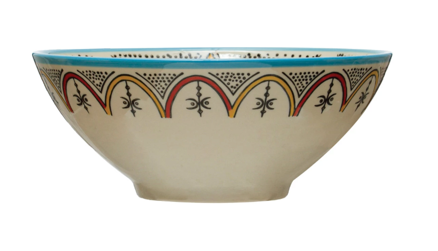 Add a vibrant, one-of-a-kind piece to your kitchen with this 10" hand-painted stoneware bowl. Each bowl is meticulously crafted with a lively, multi-color pattern, ensuring no two are exactly alike. The unique, handcrafted finish brings an artisanal feel to your table, perfect for serving a family-sized salad, holding fresh fruit, or simply as a decorative centerpiece.