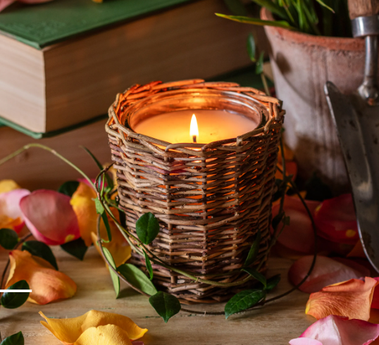 Glass vessel housed in a removable, woven, wicker case. We recommend recycling the vessel when the candle is finished. Simply scrape out any remaining wax with a butter knife and put glass vessel in the dishwasher then enjoy as a vase or votive.