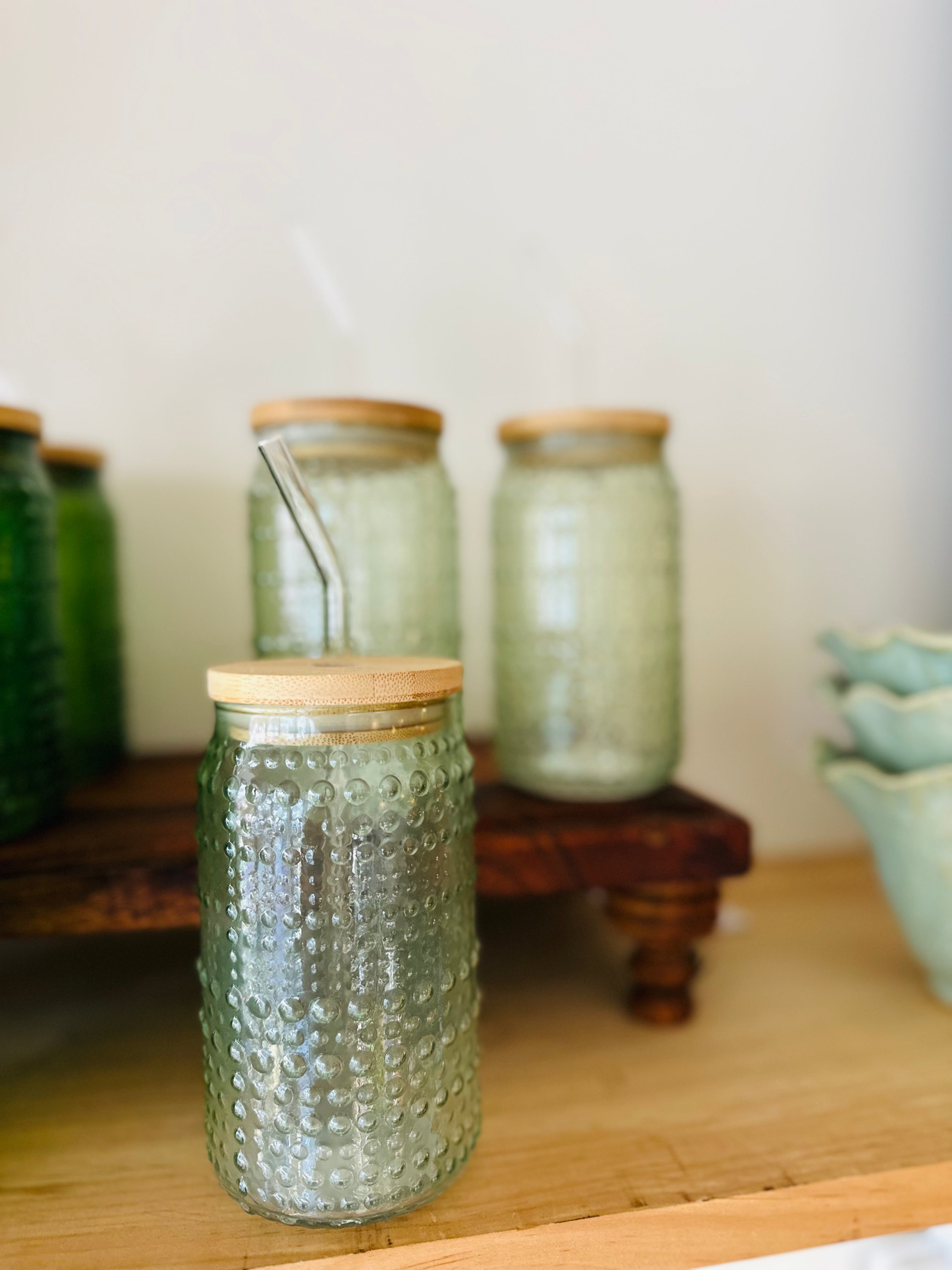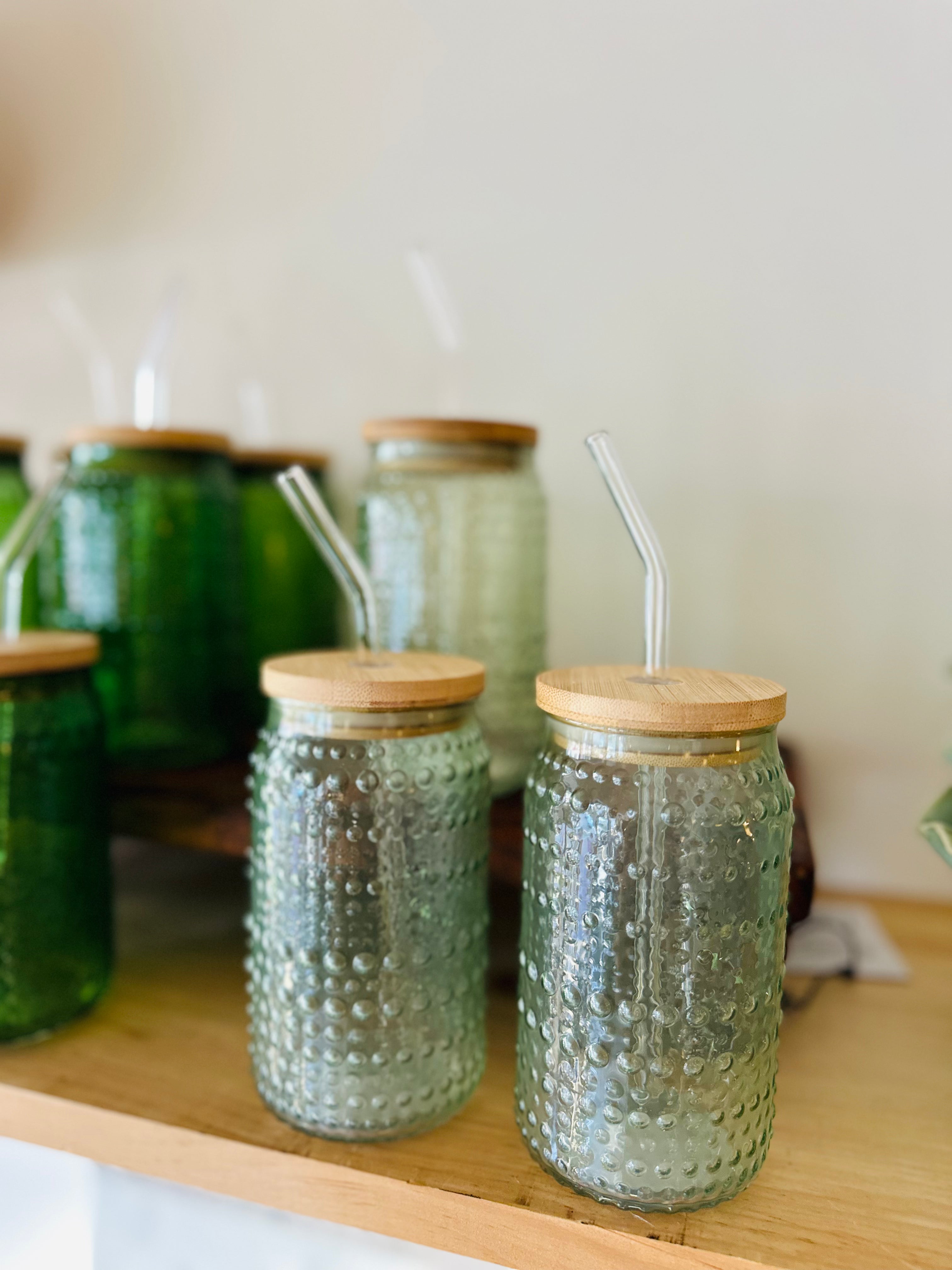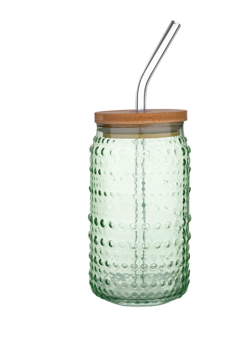Crafted from high-quality glass and topped with a natural bamboo lid, each 16 oz cup features a hobnail texture that feels as good as it looks. An included reusable glass straw makes it perfect for iced coffee, smoothies, or a refreshing summer cocktail.
