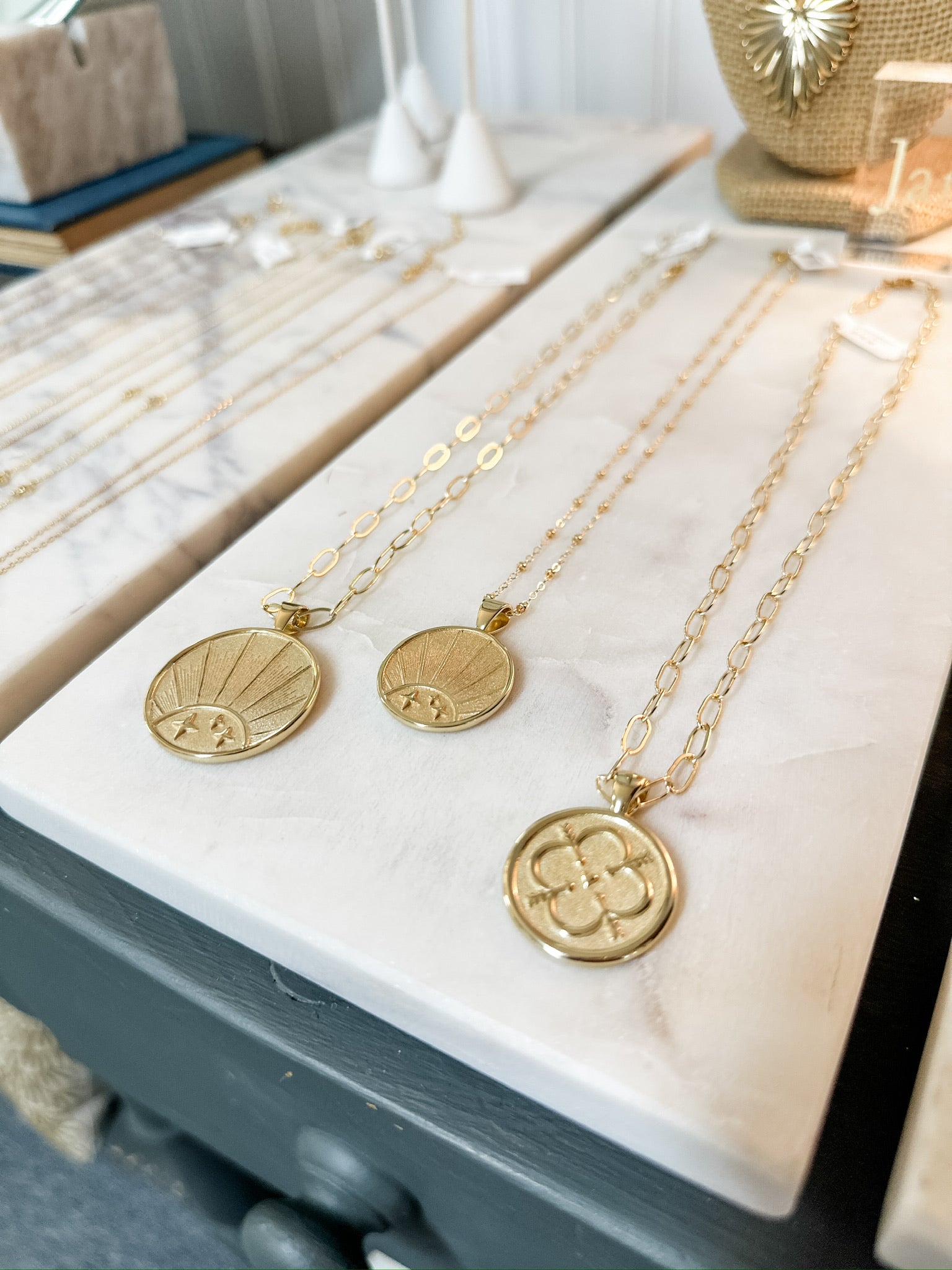 Coin pendant made of sterling silver dipped in 14k gold, measuring 0.975" in diameter.