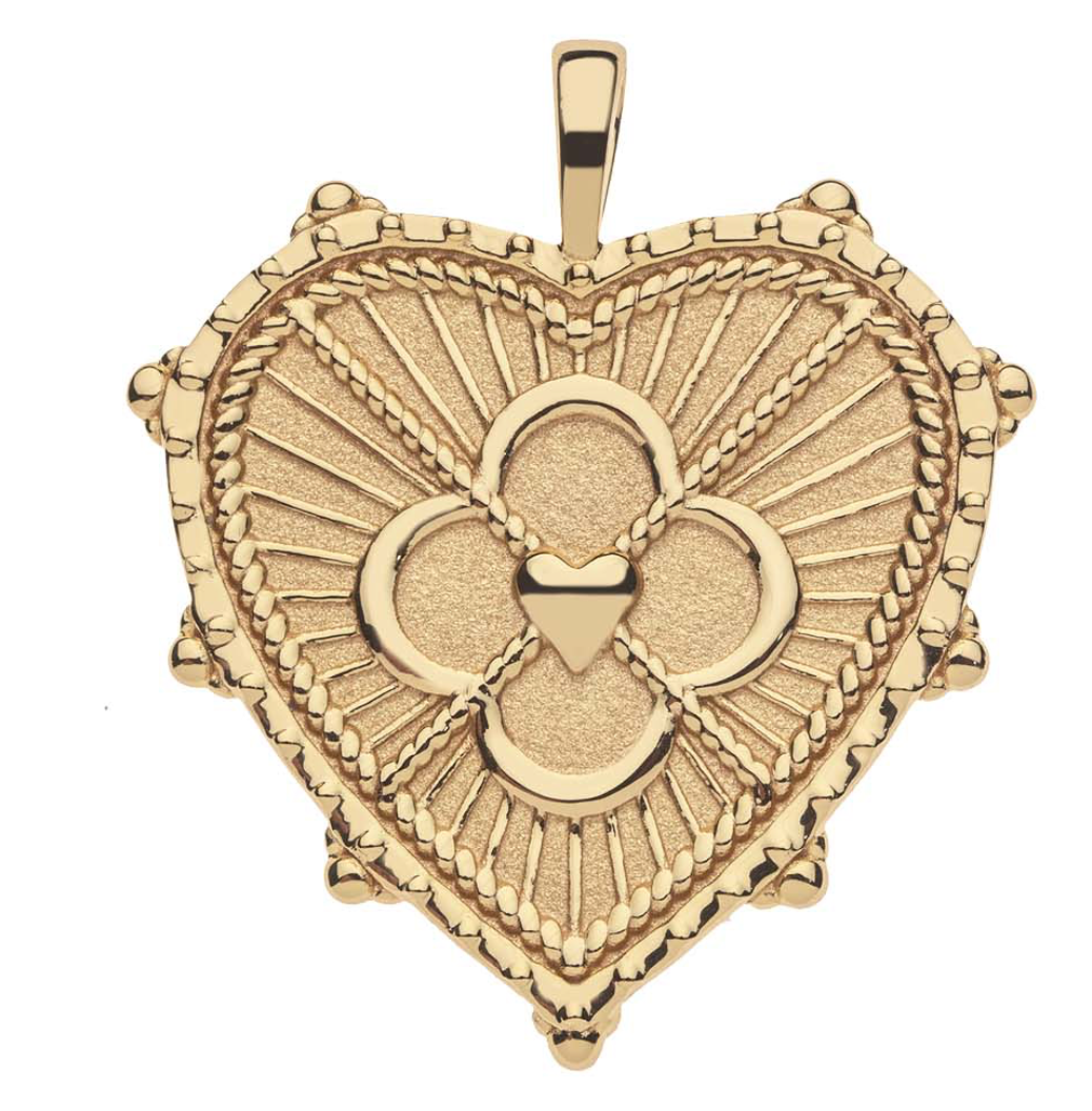 There are so many reasons to wear LOVE. this heart pendant features the classic heart and quatrefoil design on the front with the word LOVE on the back. Sold on an 18" drawn link chain