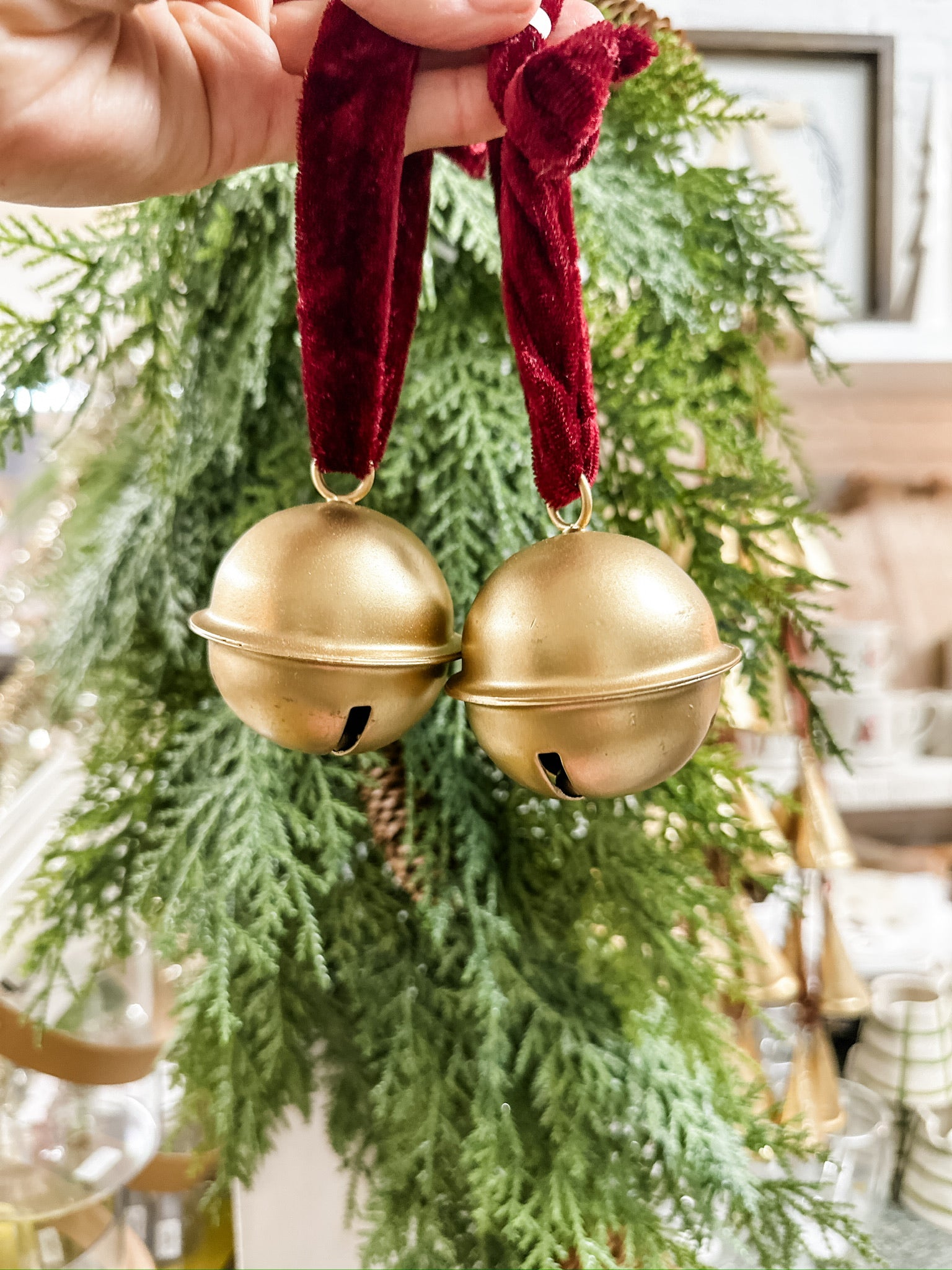 Burgundy velvet + a gold bell mix to make a festive and easy way to dress up a small wreath, loop over a door knob, tie to the back of a kitchen stool or add to a bottle wine for an elevated hostess gift.