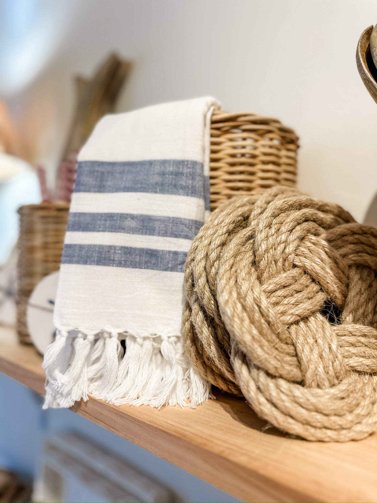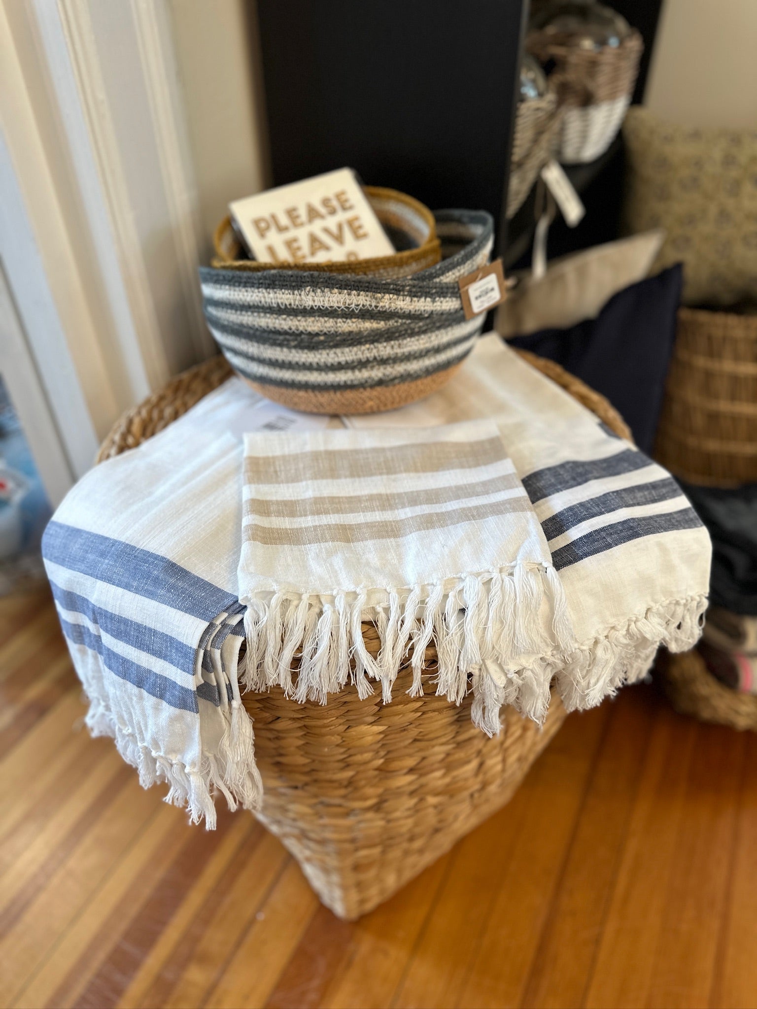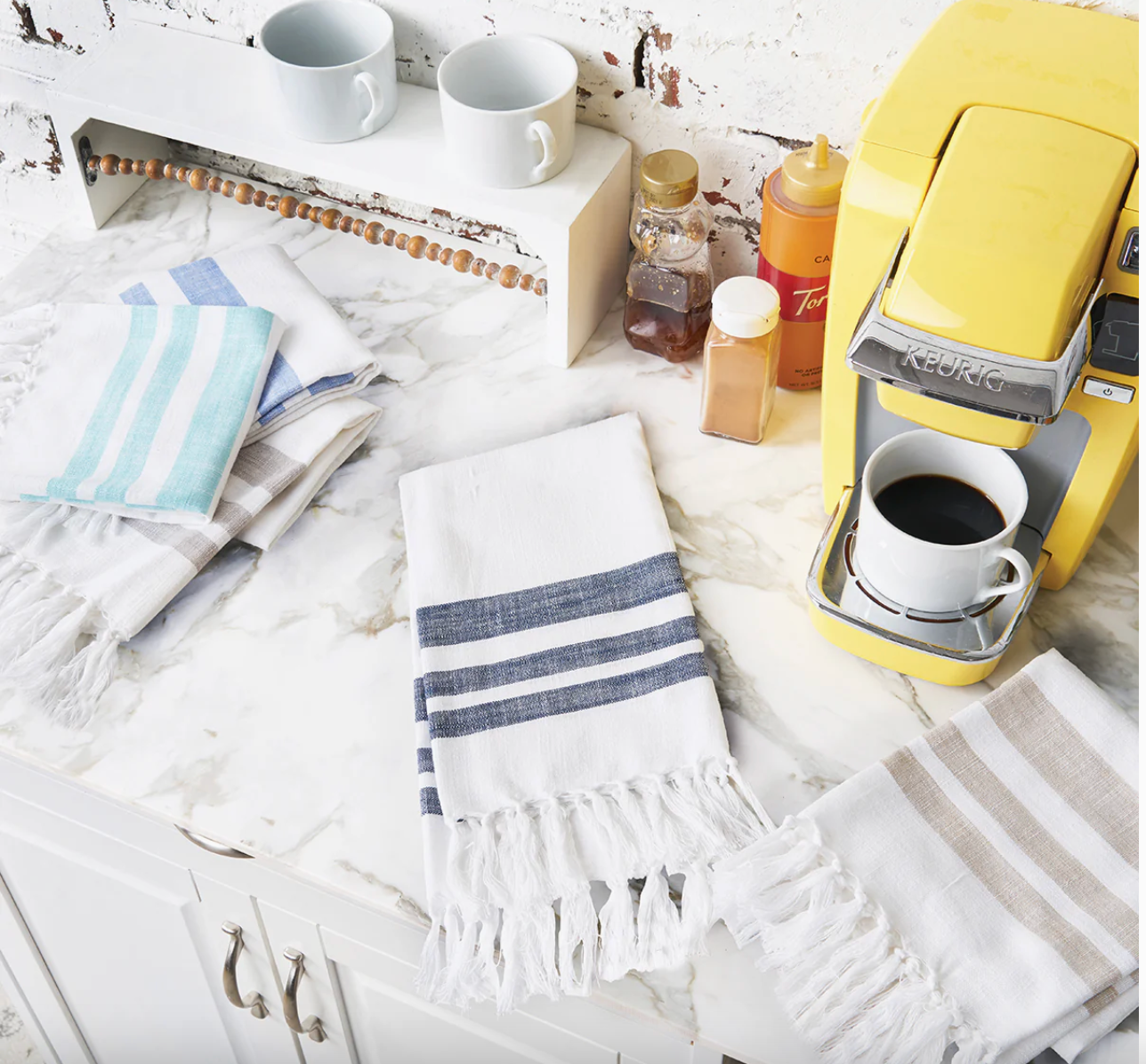 These striped cotton kitchen towels bring both style and function to your kitchen or powder bath. Crafted from soft, durable cotton, they absorb moisture quickly and dry efficiently. Their classic striped design adds a timeless touch that complements any décor while keeping your space tidy and inviting. offered in two colors.