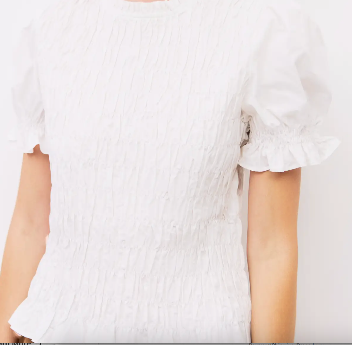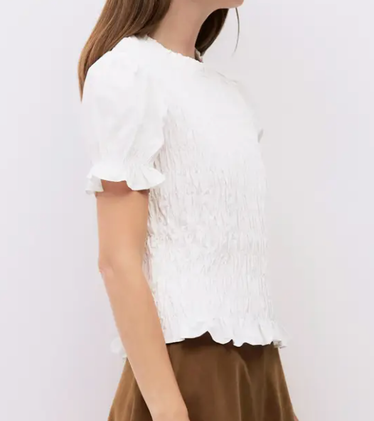 The Bristol top is a form-fitting blouse made from smocked mid weight cotton with puff sleeves. It features ruffled details along the cuffs, neck, and hem, plus a crewneck and back keyhole button closure. A delicate and structured blouse with subtle texture.