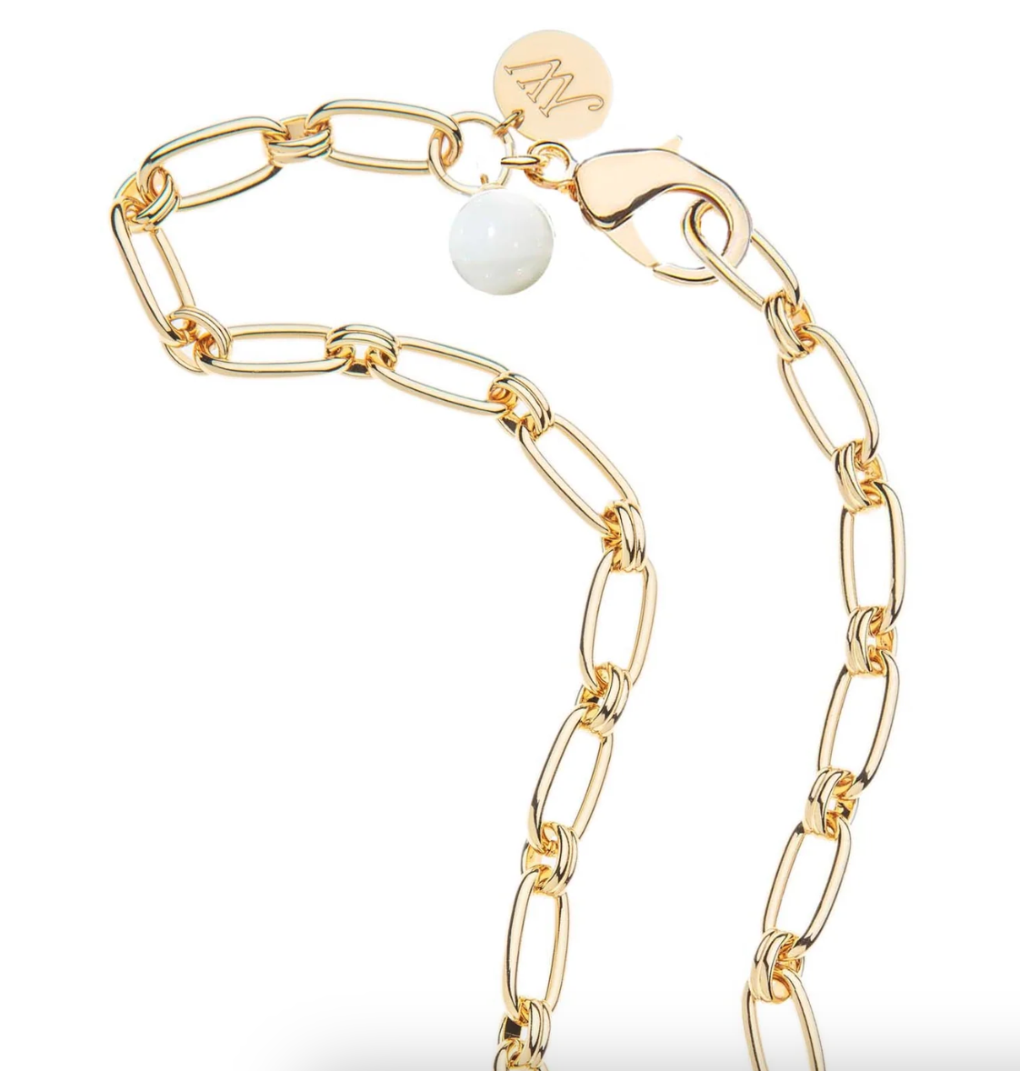Brass with 14k gold plating with a Mother of Pearl accent.