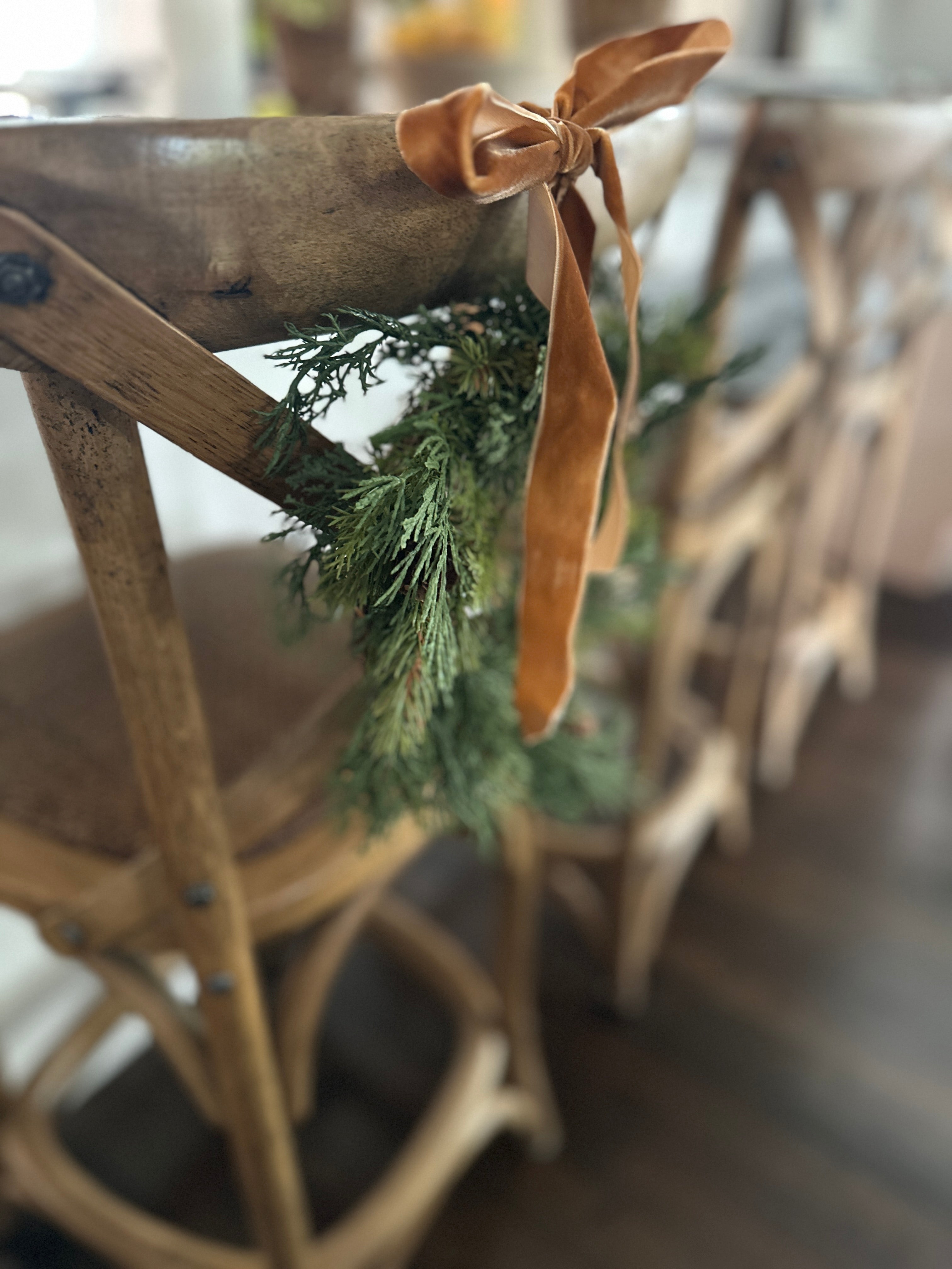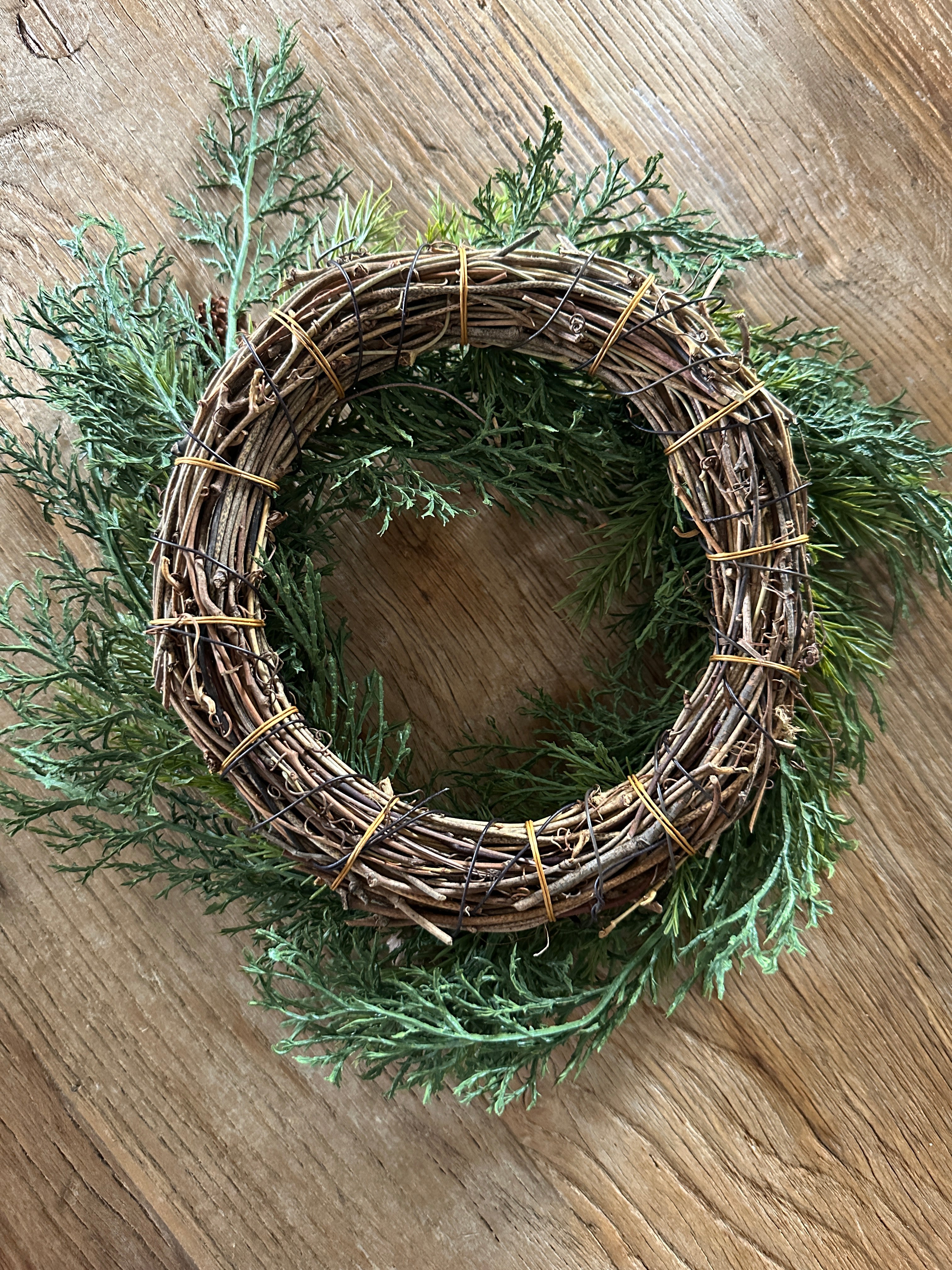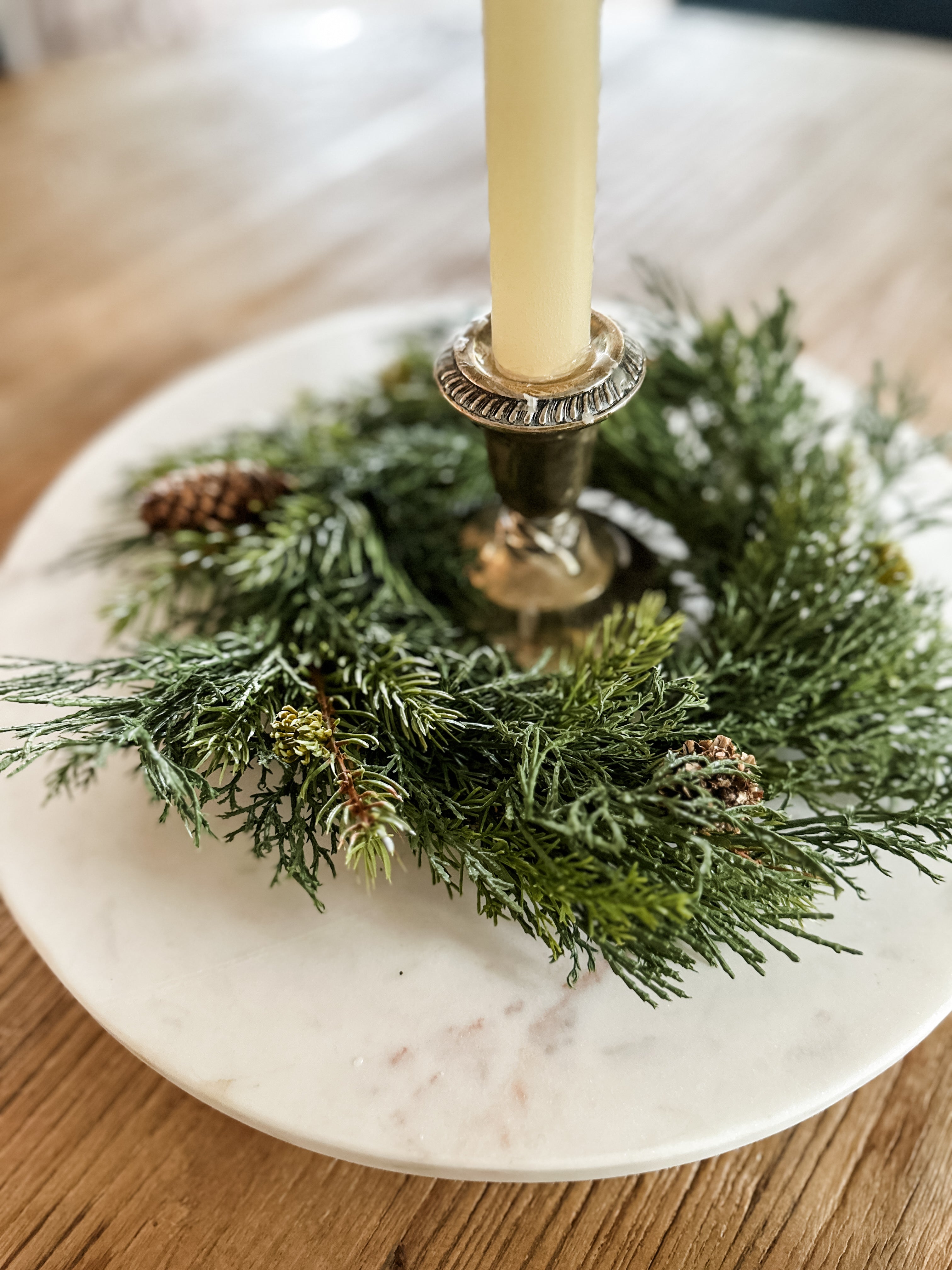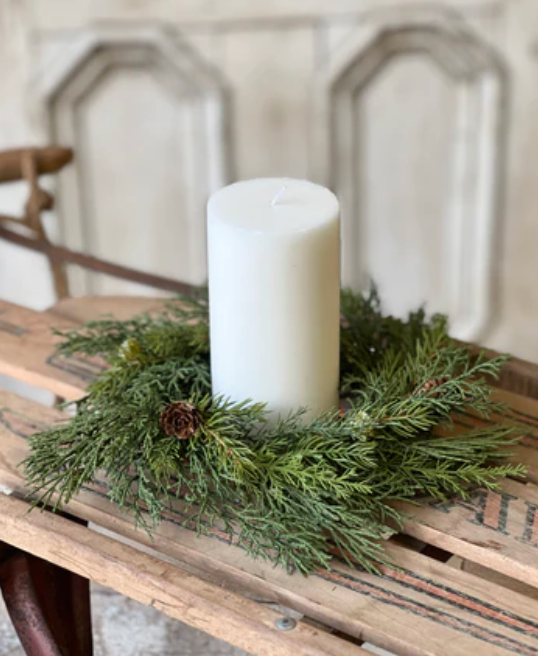 This faux green wreath features 3 types of pine, real pinecones and a twig backing. Lay it flat on table and fill with a candle taper or pillar, tie it to the back of a kitchen stool for a festive touch or even use a velvet ribbon to hang in a window.